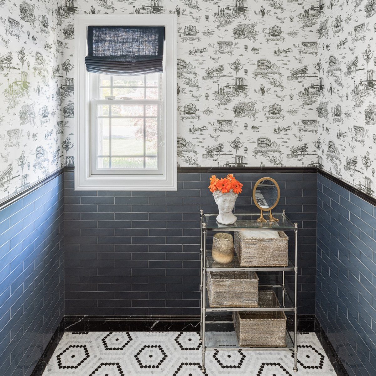 Crystal Maki designed this bathroom to pay homage to her clients’ Brooklyn roots by using Artistic Tile’s B Train subway tile in Indigo to sheath the walls. She complemented it with Artistic Tile’s Riverside Drive hexagon mosaic tile on the floor and Flavor Paper’s Brooklyn Toile wallpaper on the walls.
