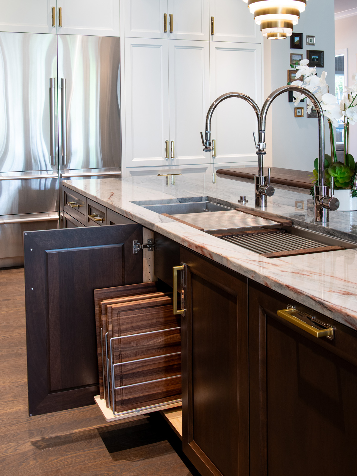 The designer notes that the kitchen island is a standout feature, with a Bison stain on walnut that grounds the large piece, coordinating with the floor color. The ‘D’ curve shape of the eating area mirrors the arches on the end panels. A workstation sink replaced the second sink the owners had previously and provides an efficient, multi-functional space for meal prep and cooking.