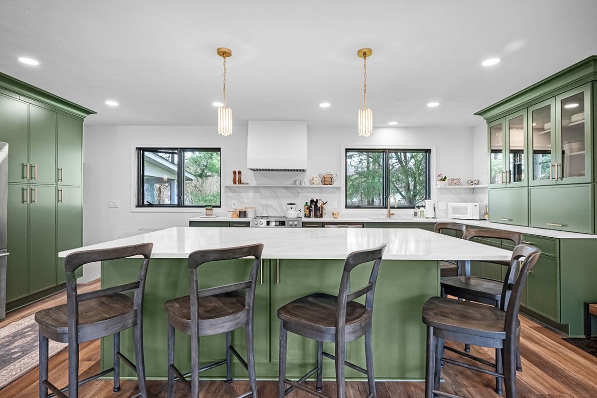 Hunter green cabinetry from Fabuwood that evoked a sense of tradition and elegance was chose to anchor the space, accented with gold hardware from Miseno for a touch of modern luxury. The combination proved to be both versatile and enduring, notes the designer.