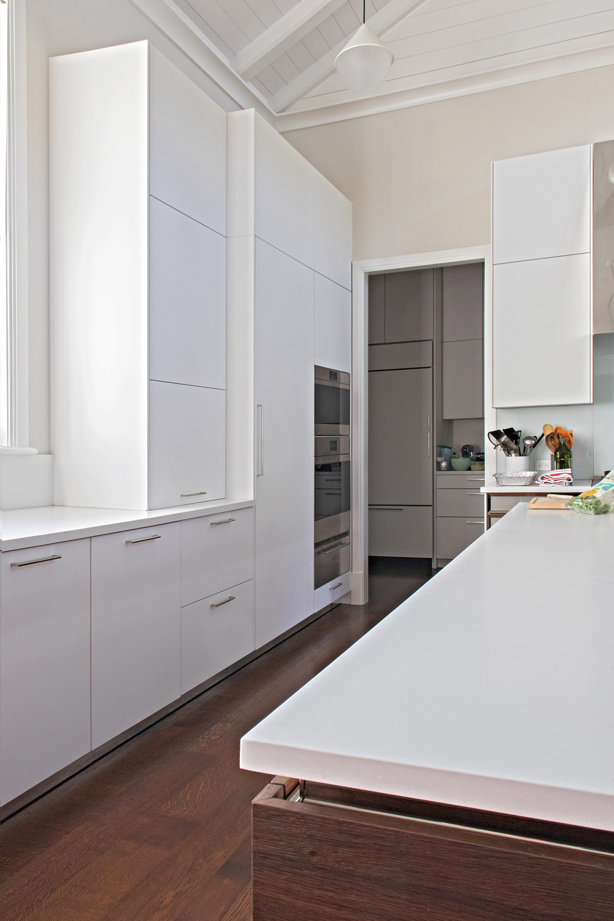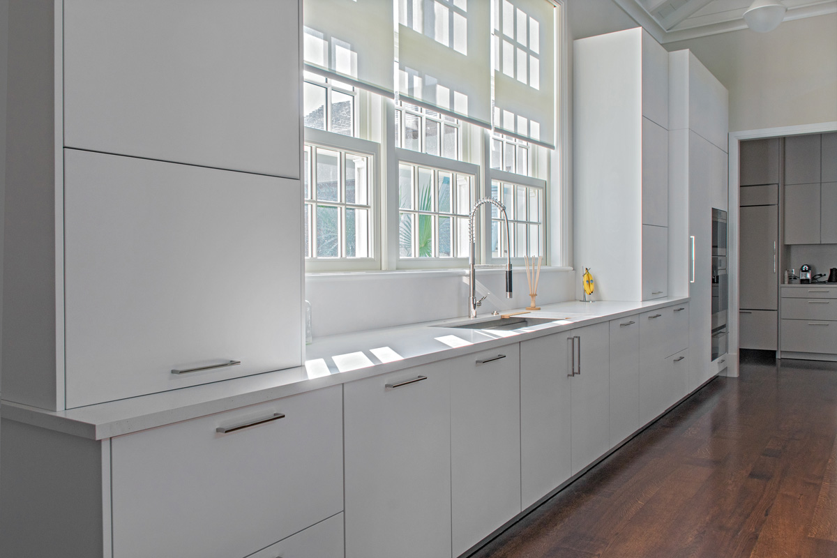 The Lotus White Velvet Matte Anti-Fingerprint Lacquer perimeter cabinets help to accent the richness of the wood. A bank of tall cabinets on either side of the kitchen’s large window provide storage for smaller appliances.