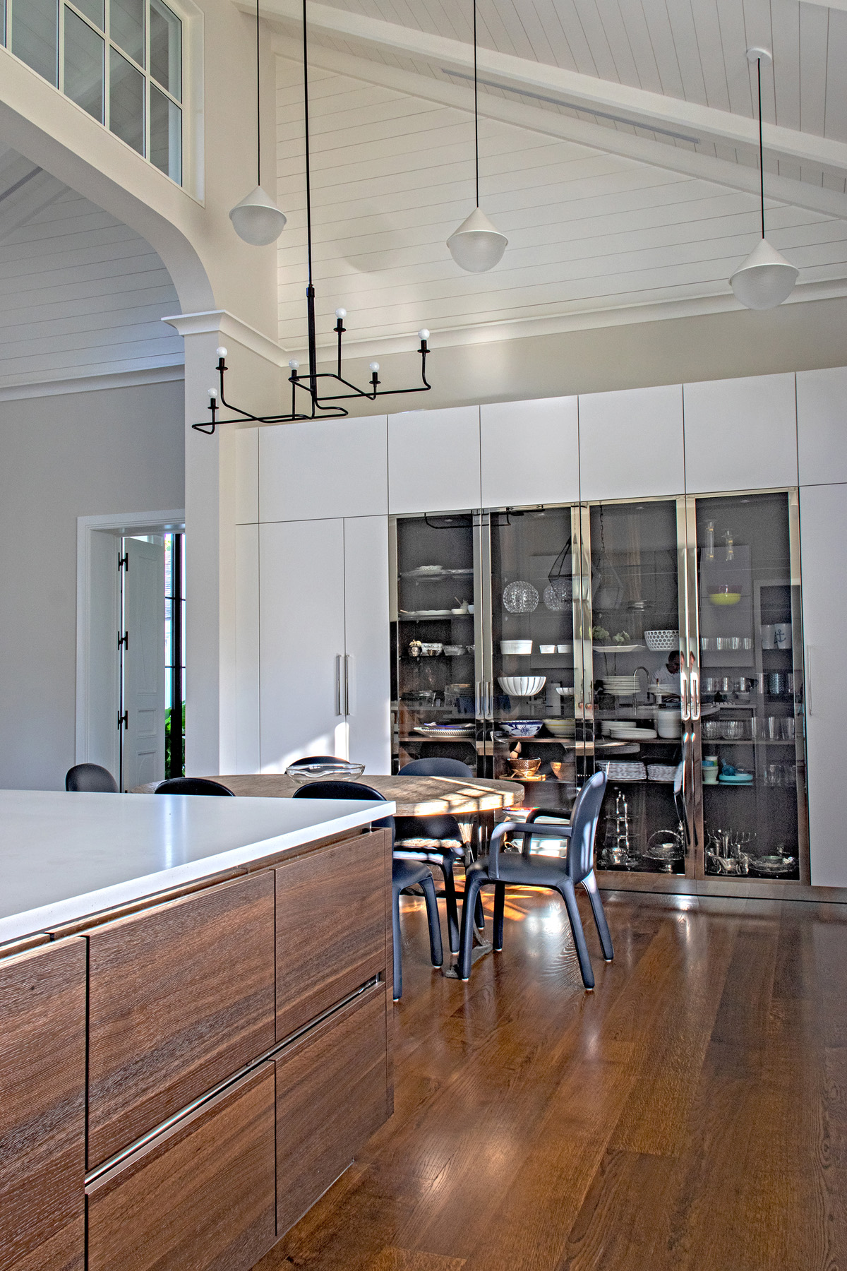 Robert Dobbs, CMKBD, who has worked with the couple on two previous kitchens, set about transforming this space into a modern architectural kitchen that also reflected a sense of history. The design blends traditional elements including cathedral ceilings, wood planks and Georgian-style windows with clean-lined cabinetry from SieMatic.