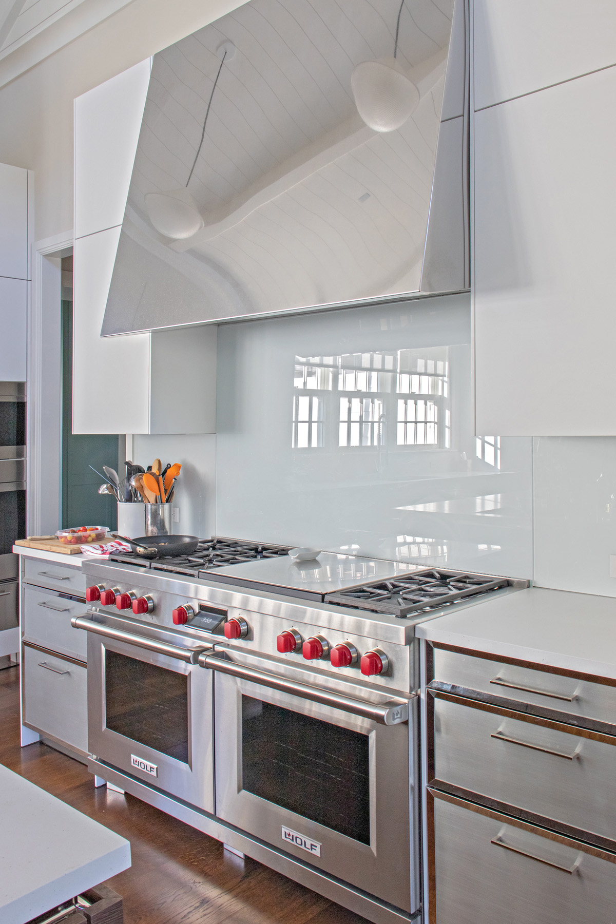 The kitchen’s cathedral ceilings allow for double-stacked cabinets for plenty of storage, and flank another statement piece: an oversized, 4′-tall mirrored stainless steel range hood. “The custom hood infuses a sense of Beaux Arts style into the sophisticated-yet-casual kitchen design,” Dobbs remarks.