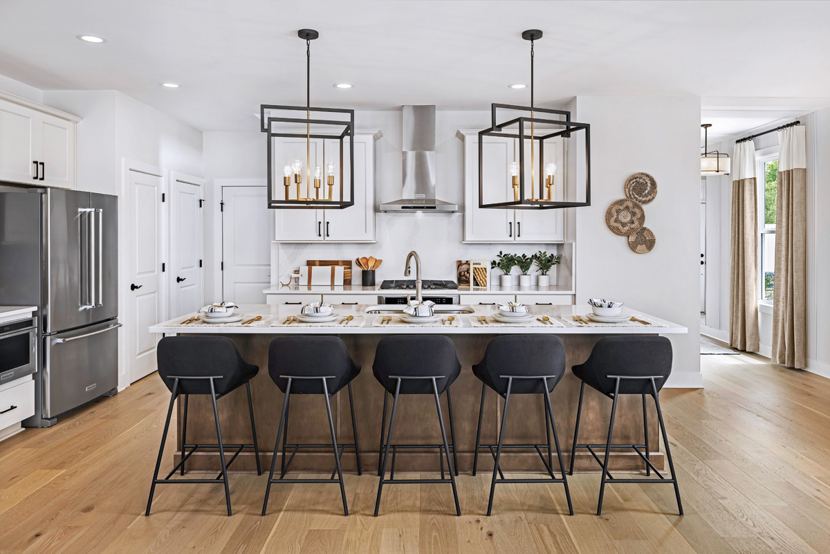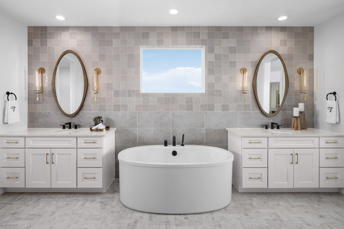 Digital showers are also a strong trend, the Toll Brothers executive says, giving each user personalized controls. Floating vanities with motion-sensor LED lights underneath for a soft glow illuminating nighttime visits are popular. “No more stumbling around in a dark bathroom in the middle of the night or turning on the lights and being blinded!” she declares. Additional lighting inside the cabinets, undercabinet lighting, toe kick lighting – all on voice-activated dimmer switches – are trending.