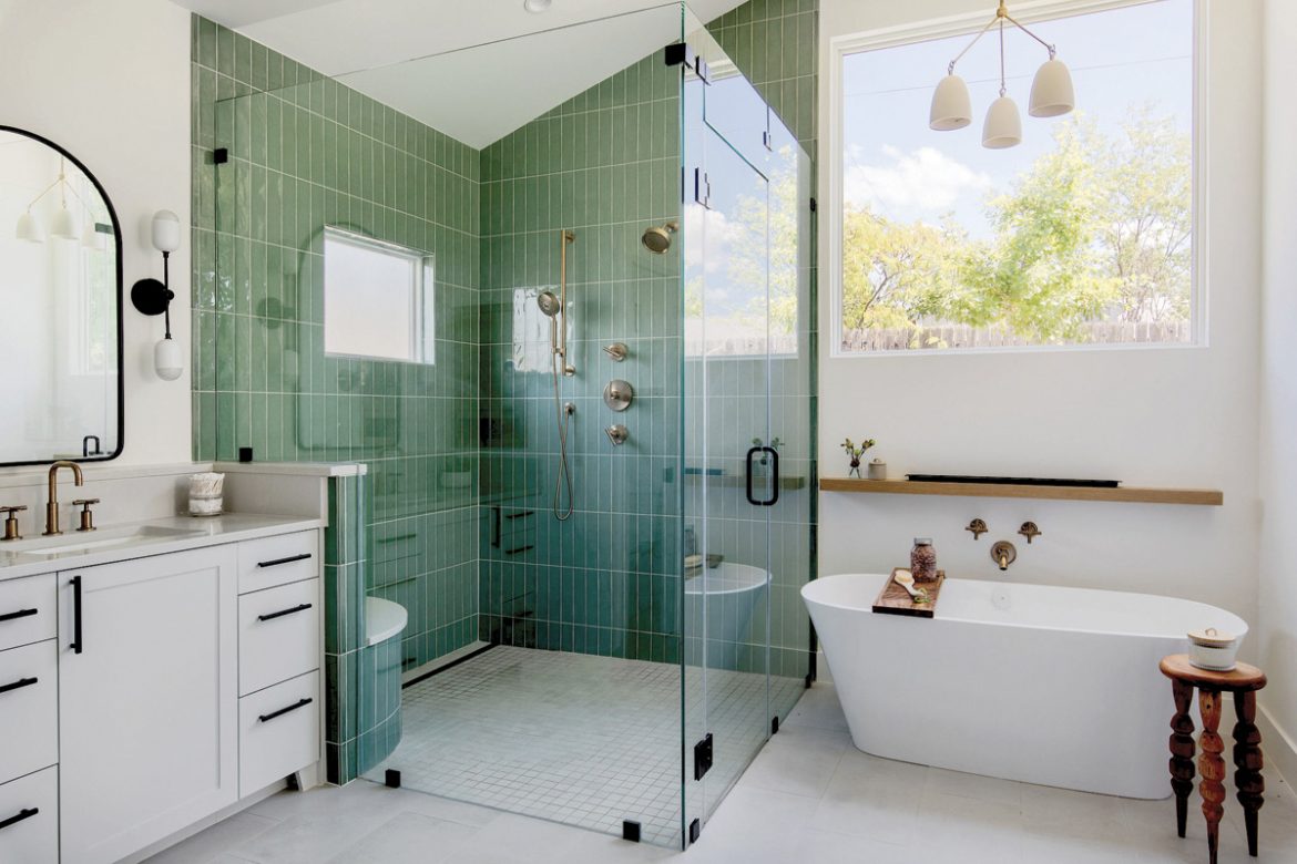 Levitt’s clients are requesting more storage options, like vanity cabinet accessories and creative solutions for storing linens and bathroom necessities. They also like recessed towel niches, cabinet pullouts for hair dryers, and appliance garages that conveniently store electric toothbrushes off the counter. She’s also seeing wallpaper making a comeback to personalize client spaces, framed shower enclosures (as opposed to glassed-in), arched entrances, curved mirrors and textured tiles in fun colors and patterns.