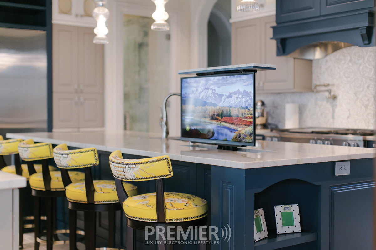 “The old separate dials and gadgets for lighting, exhaust fans, towel warmers, heated floors, shower controls, etc. have gone away in favor of a simple, unified integrated touch-panel control. Wall clutter is GONE and should never come back!” declares Barth. What the integrator has started seeing this year is large-format touchscreen/control panels in the kitchen, often 21″ and larger, “sitting on the corner of a countertop, or on the island that can be used not just to control the home through an app (Control4, Crestron Home, Lutron, JoshAI, etc.) but also to act as the hub of the family. You can call up a Google calendar with the family schedule, or watch content via YouTube TV or Netflix, or just to look up a recipe or other information.” Clients love these command centers, he comments. There’s also an urge toward ‘hidden’ tech, like Samsung’s Frame TV showing artwork when not in television viewing mode.
