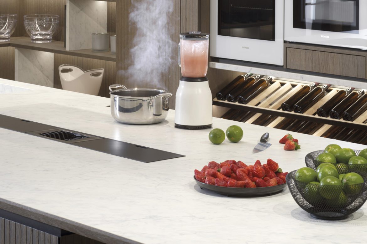Trend Spotting readers are likely familiar with the integration of induction hobs and cell phone charging into porcelain slab countertops. On display at Coverings this year were some add-ons to that technology integration trend. Porcelanosa was showcasing its Smart Kitchen system that comes with a compliant cordless countertop blender. Theoretically, any small appliance using the same type of wireless inductive electrification technology will also work. Will this type of offering spur development of more compatible small countertop appliances? Quite possibly! Food processors, toaster ovens, coffee makers and air fryers are all popular categories that could be added in the future.