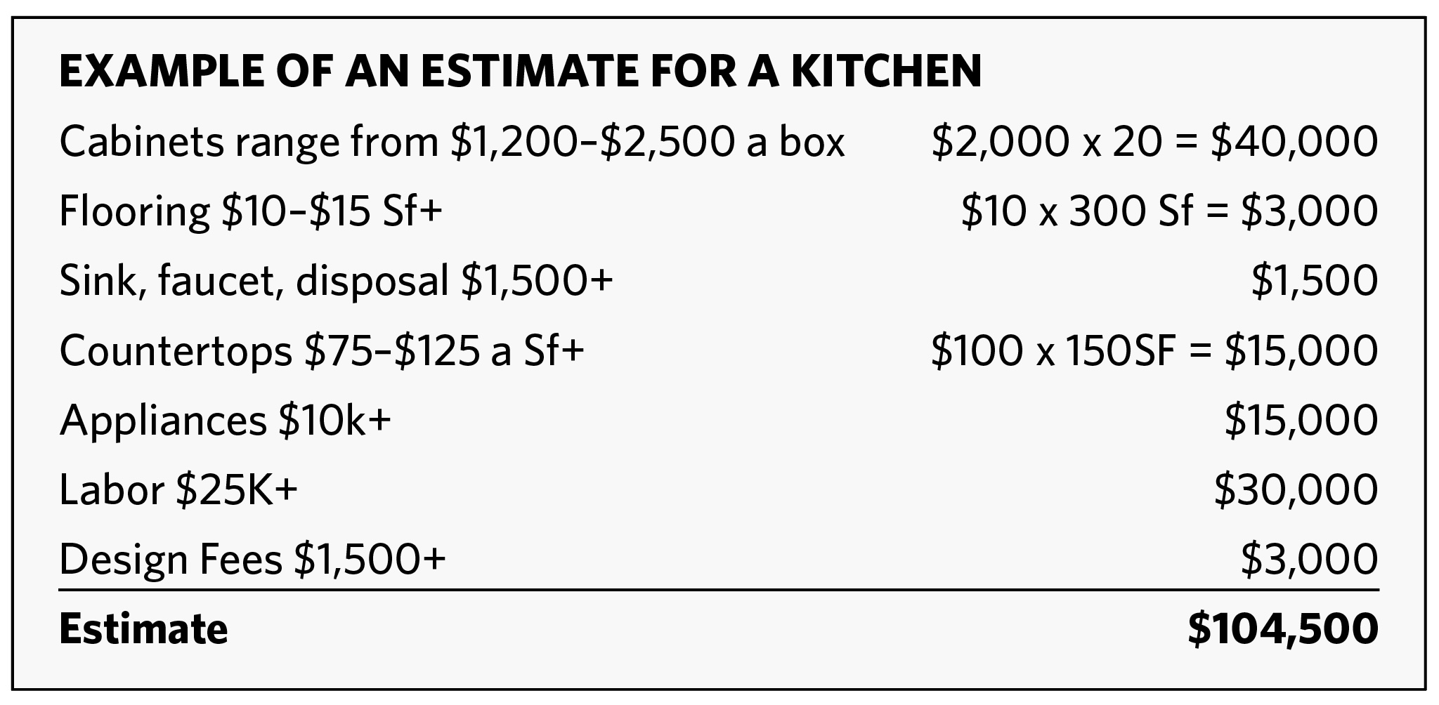 I start the estimating process by stating, “If you are unclear how much your kitchen could cost, let me help you with a baseline estimate.” I then start by using their existing kitchen to get an estimate; I count cabinets, quickly measure countertops and write down the selling price line by line, calculating the total and handing over the paper. I note that this is a quick estimate for the current kitchen, and the cost would go up if the design changed or the space was expanded.