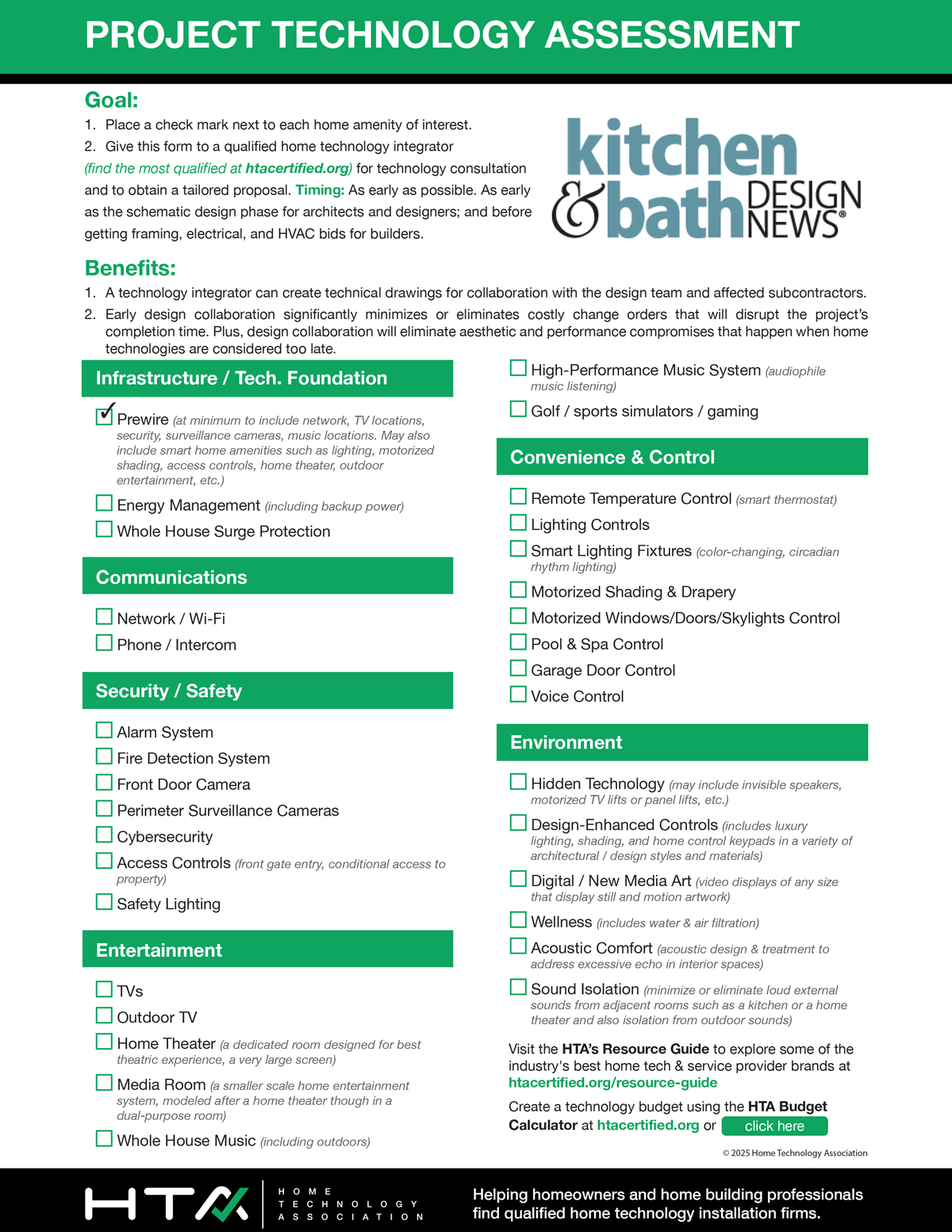 Recognizing this knowledge gap, industry professionals requested a concise tool to communicate available technology solutions clearly to their clients. The HTA responded by developing the Project Technology Assessment form – a one-page “cheat sheet” that allows designers and builders to present clients with a comprehensive yet easy-to-understand overview of potential technology amenities, enabling meaningful discussions about technology early in the design process.