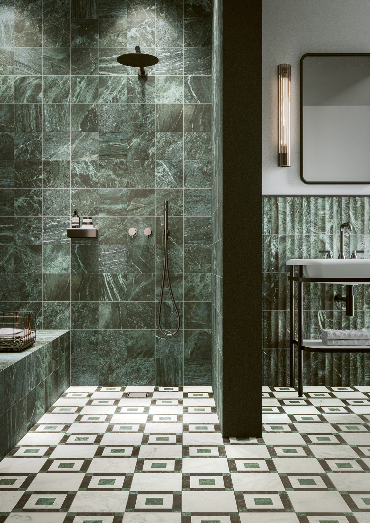 Crafted in Italy by the creative ceramic studio 41Zero42, Opustone’s Dandy Collection of glazed porcelain tiles presents a refined interpretation of marble featuring clean, distinctive geometric patterns. The tile is available in a white, black and green color palette in a number of patterns.