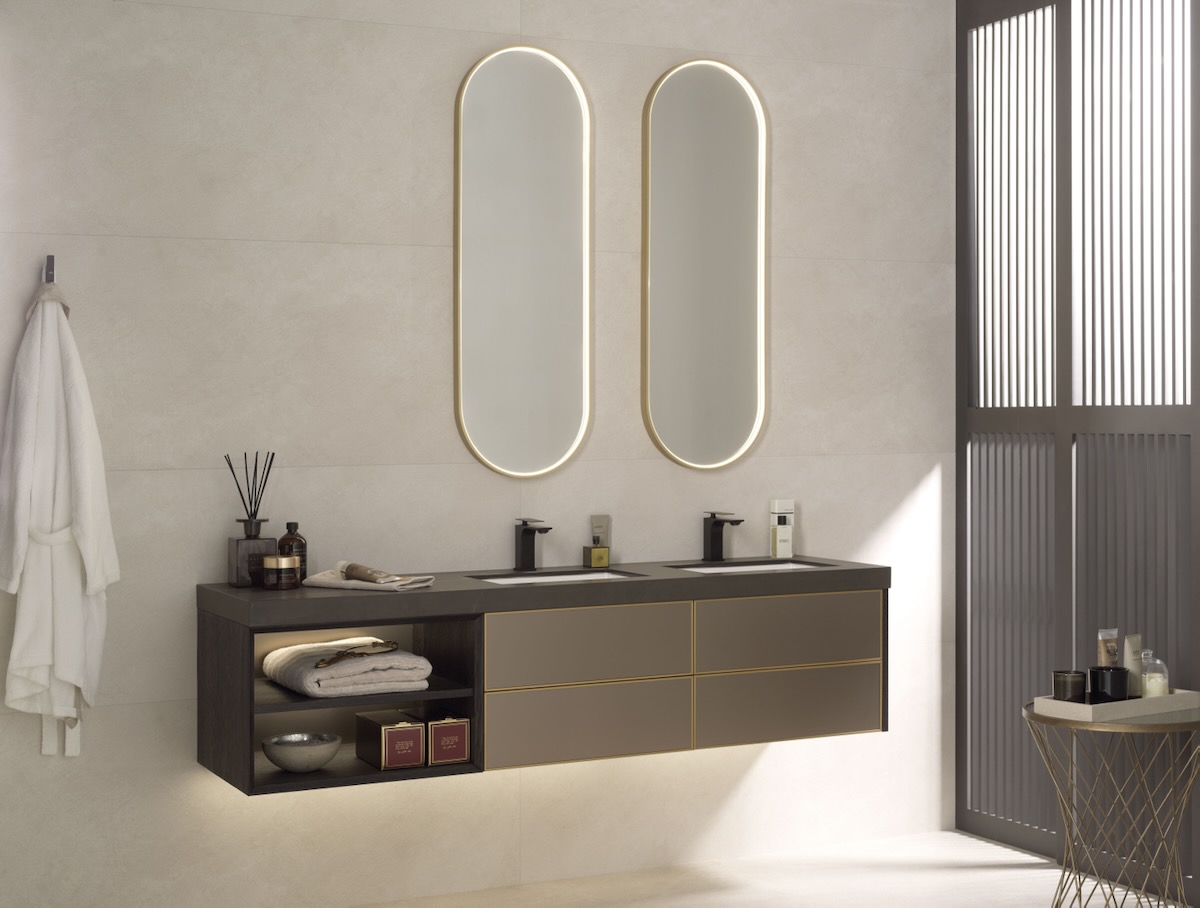Symphony by Gamadecor, part of the Porcelanosa Group, features metallic front finishes that deliver a modern look. Characterized by its framed fronts with a metallic finish, the modular series offers different combinations that allow it to adapt to a variety of designs.