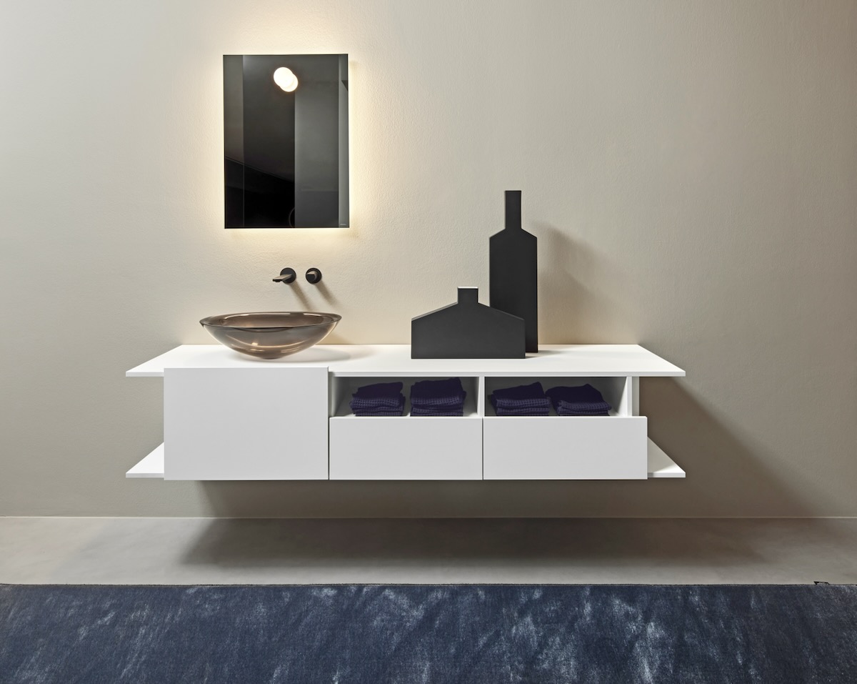 From antoniolupi comes the NEMESIS collection, a modular bath collection made of SMART_HPL. It comes in lengths ranging from 54 cm to 216 cm, and three different heights. Five solid shades and three wood finishes are offered, with doors that can be customized in colors from the firm’s color chart.
