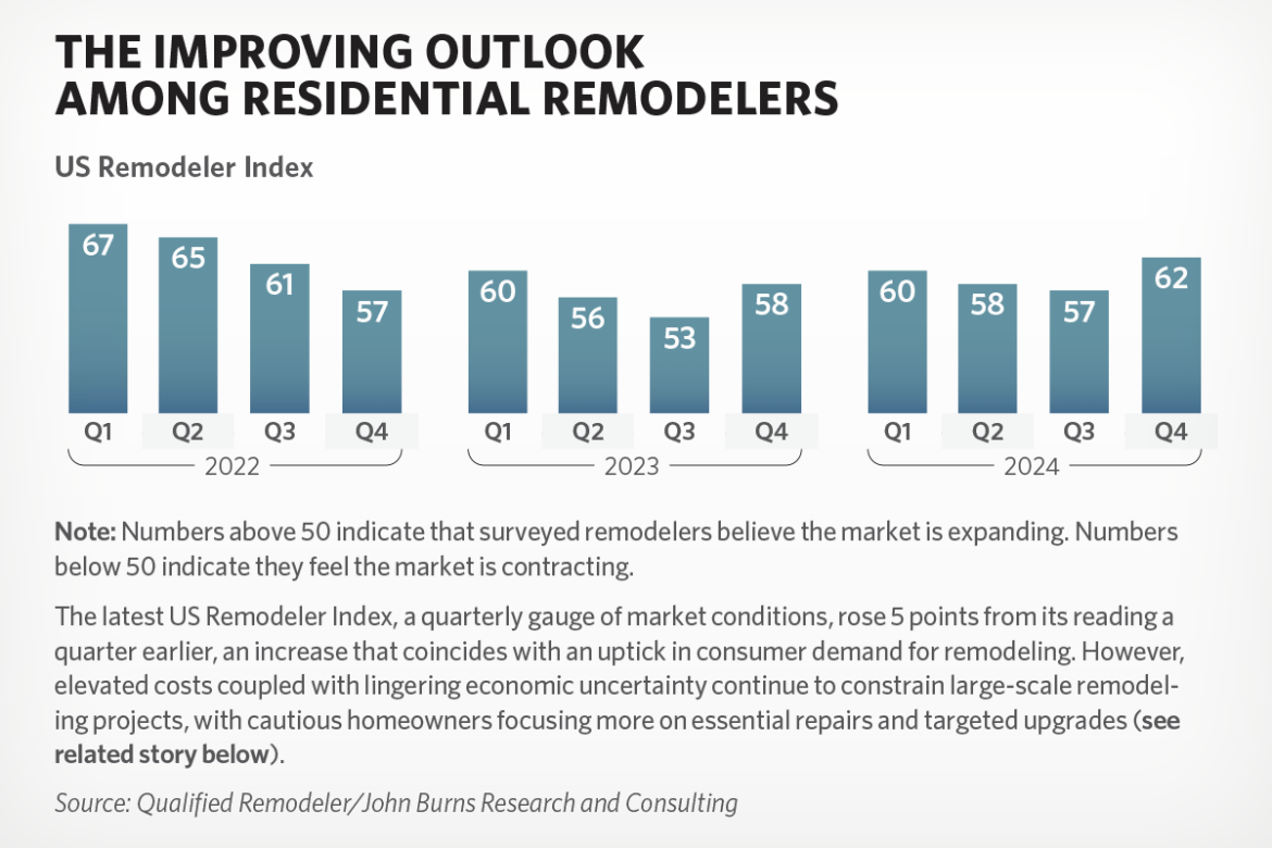 “Strong” results in the fourth quarter of 2024 are fueling optimism among businesses across the nation’s residential construction, architecture and design sectors, according to a report from Houzz Inc., the Palo Alto, CA-based online platform for home remodeling and design.The Q1 2025 “Houzz U.S. Renovation Barometer,” released in recent weeks, found that expectations among design and construction professionals are at their highest level since the third quarter of 2022, said Houzz.“Strong Q4 performance and recent federal interest rate cuts have bolstered confidence among industry professionals,” said Marine Sargsyan, staff economist for Houzz. “With this solid foundation, construction firms are expressing the most positive sentiment we’ve seen in two and a half years.”