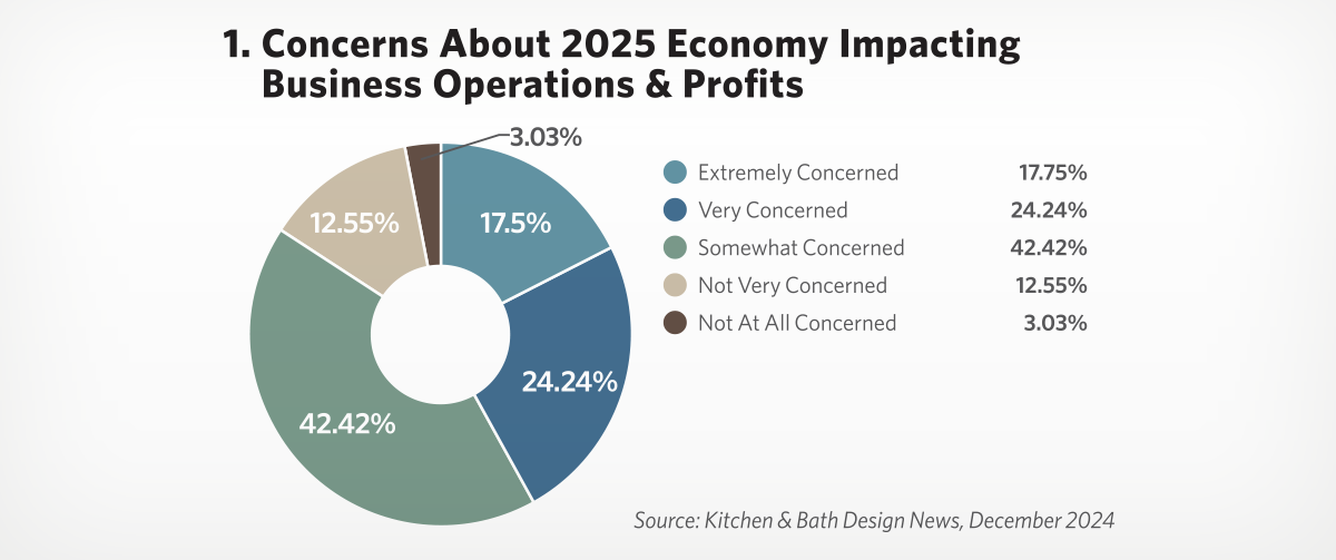 According to a nationwide survey conducted by Kitchen & Bath Design News, dealers and designers, while forecasting 2025 revenue gains, report that they harbor nagging concerns about economic and geopolitical factors potentially stunting sales revenue and profit margins in the coming year (see Barometers and the related stories below).