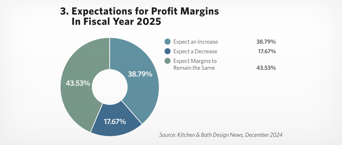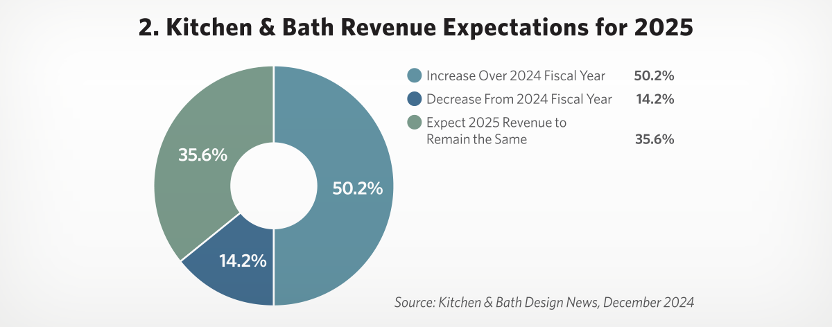 Those concerns are mirrored in 2025 revenue projections, which are evenly split among KBDN survey respondents. Indeed, while roughly 50% of those surveyed say they expect 2025 kitchen and bath revenue to post gains over last year, an equal percentage expect 2025 annual revenue to either remain flat or decline compared to 2024 (see Figure 2).