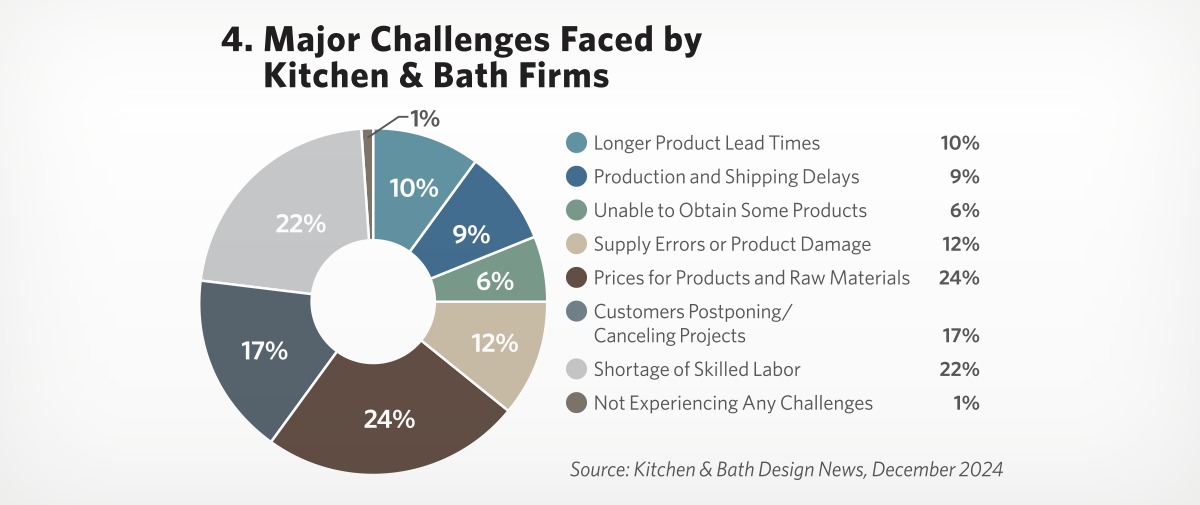 Prices for products and raw materials top the list of major challenges currently facing kitchen and bath design firms, survey respondents report. Other challenges include a significant recent turnover among independent and factory sales reps and customers postponing and/or canceling projects (see Figure 4).