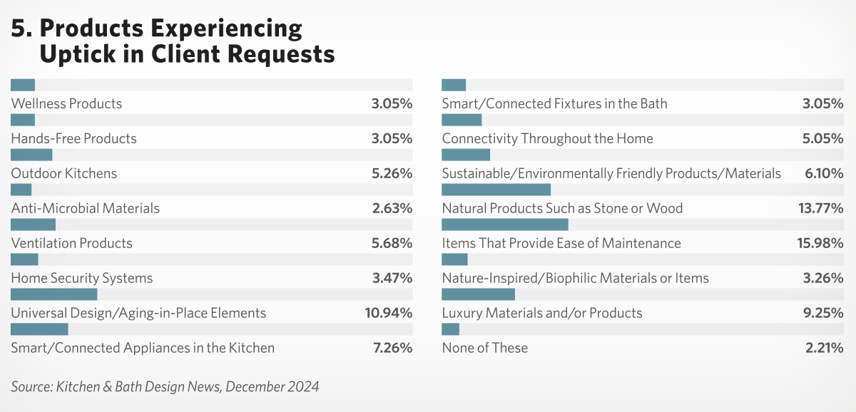 - Products that provide for ease of maintenance, along with natural products such as stone and wood, lead a long list of products that are currently in demand among kitchen and bath consumers. Among other leading in-demand products are universal design/aging-in-place elements, survey respondents report (see Figure 5).