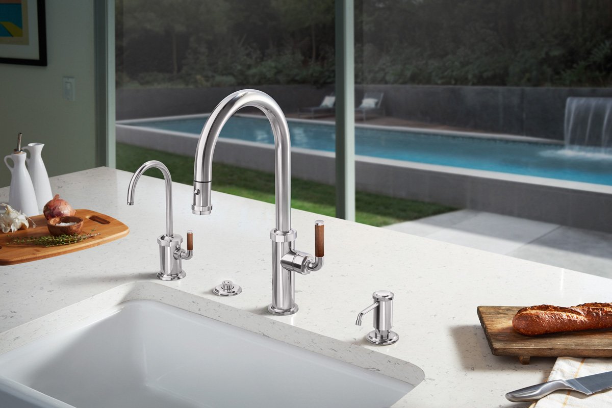 California Faucets has added teak wood to the customization options available for its Descanso Series of kitchen faucets. The solid brass faucet, which features a modern industrial aesthetic, is available in the company’s 25-plus artisan finishes.