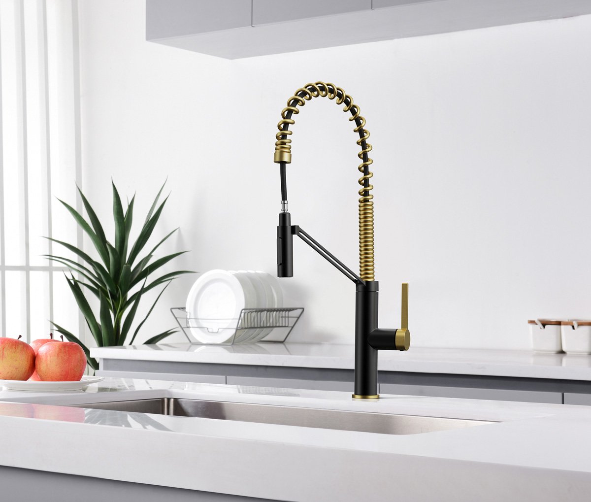 The Lenova K224B kitchen faucet, made of T304 stainless steel, showcases a double-function spray head with Neoperl aerator. The faucet features a ceramic cartridge with diamond content for drip-free operation. Featured is Matte Black and Brushed Brass/Gold two-tone with an extra PVD layer.