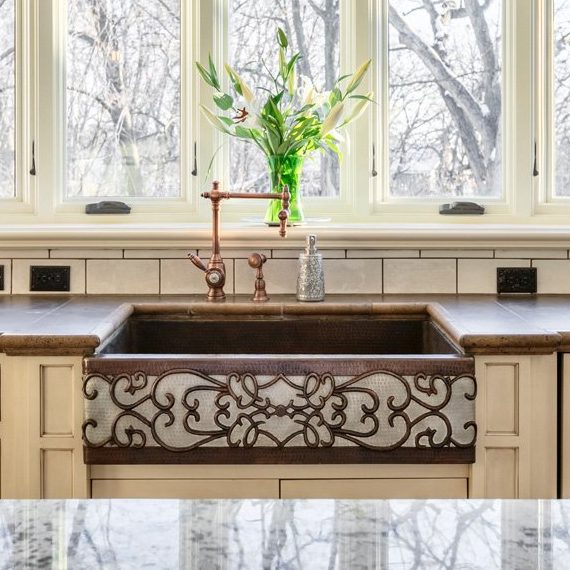 Premier Copper Products offers a variety of sizes, designs and configurations for its artisan-crafted copper kitchen sinks. Shown is a 33″ Hammered Copper Apron Front Single Basin Kitchen Sink, complete with scroll design and nickel background. Each piece is hand hammered, making them one of a kind.