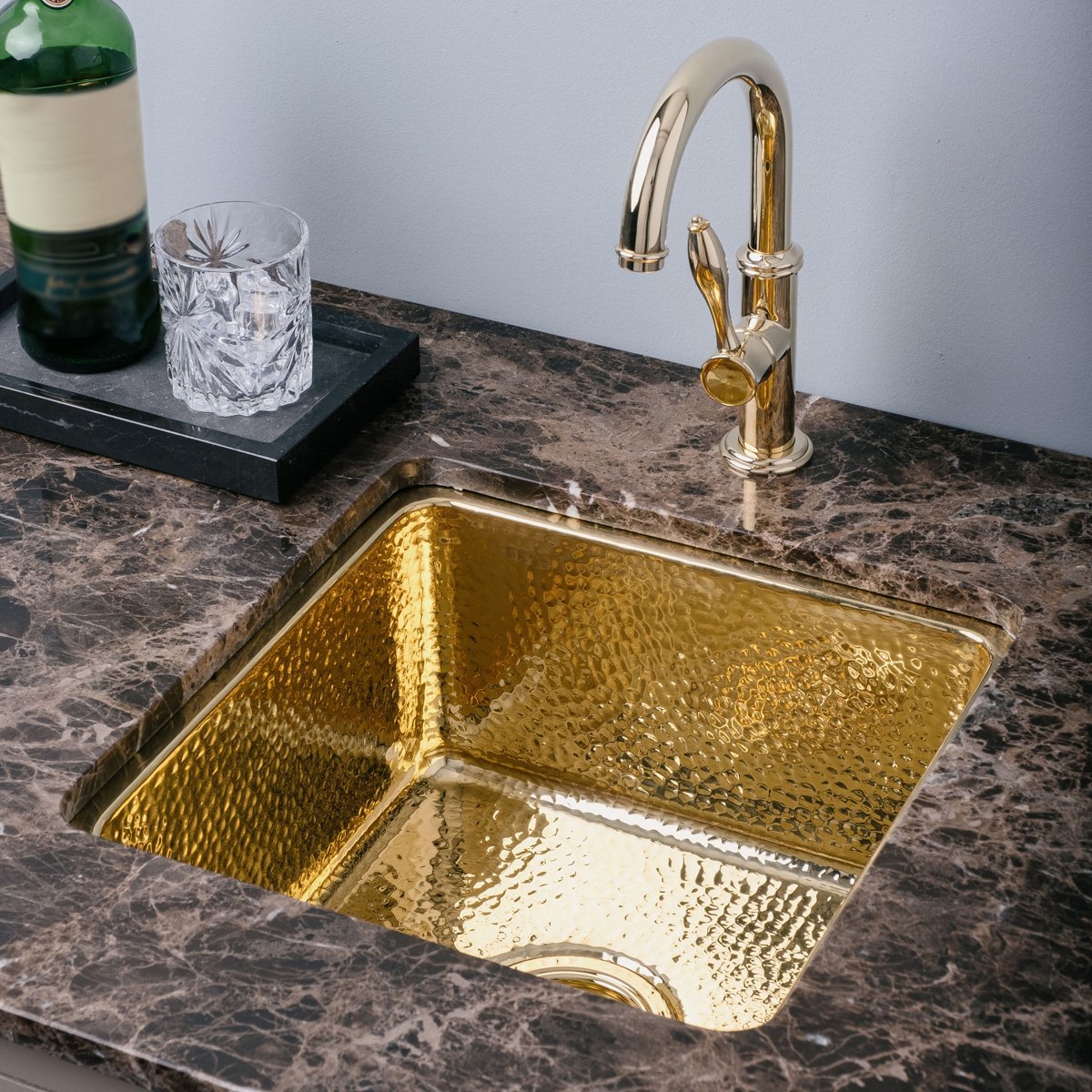Stone Forest’s Brass Prep Sink merges the natural warmth of hand-hammered brass with artisan craftsmanship. The sink basin is available in brushed or polished brass and accommodates a 3.5″ kitchen drain. The sink, which is also available in a stainless steel variation, measures 15″x15″ and is 7.5″ deep.