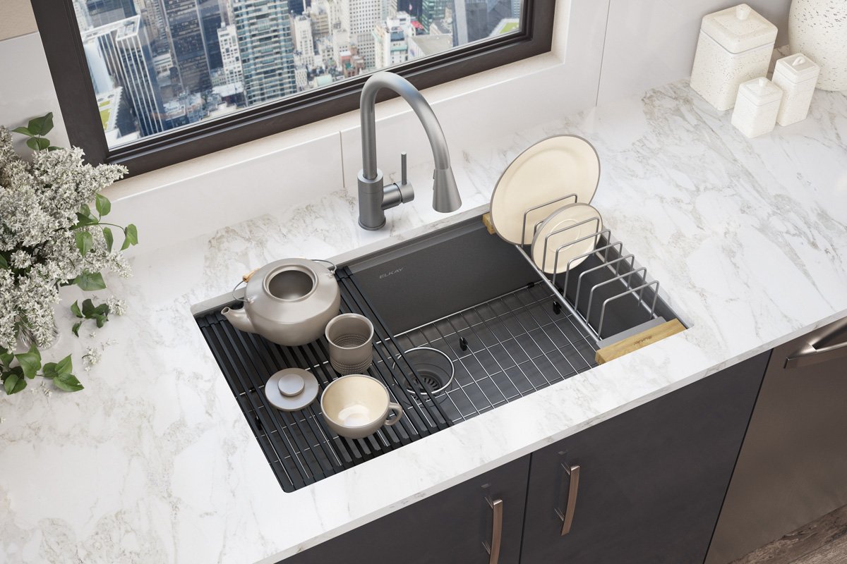 Zurn Elkay Water Solutions has launched Quartz Classic Workstation sinks, crafted from natural quartz and acrylic resins for an organic look and feel of stone. The sinks include an acacia wood cutting board, colander, drying rack, roll-up drying rack, bottom grid and color-matching drain.