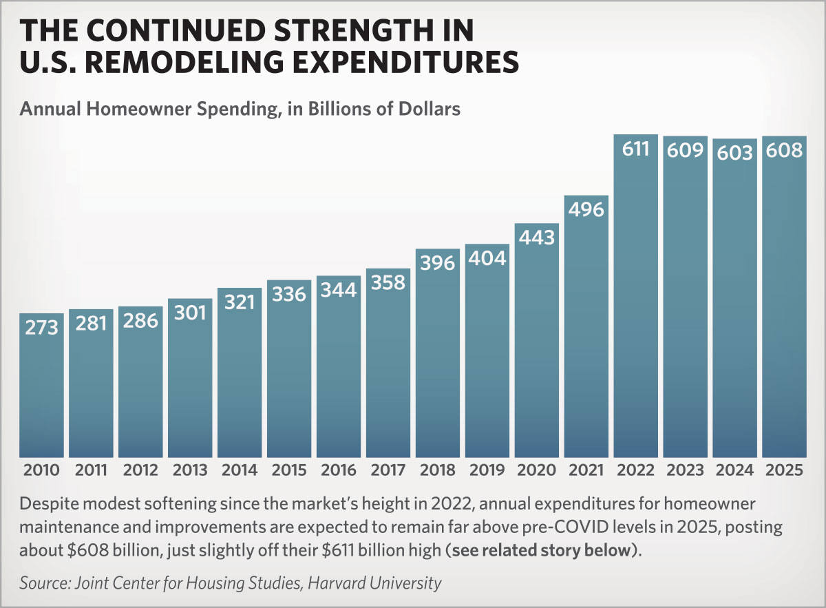 Spending in the U.S. residential remodeling market reached unprecedented heights in the wake of the COVID-19 pandemic, soaring above $600 billion for the first time in 2022. And despite modest declines the past two years, market expenditures for improvements and repairs to owner-occupied and rental properties is expected to remain “far above” pre-pandemic levels in 2025. KEEP READING