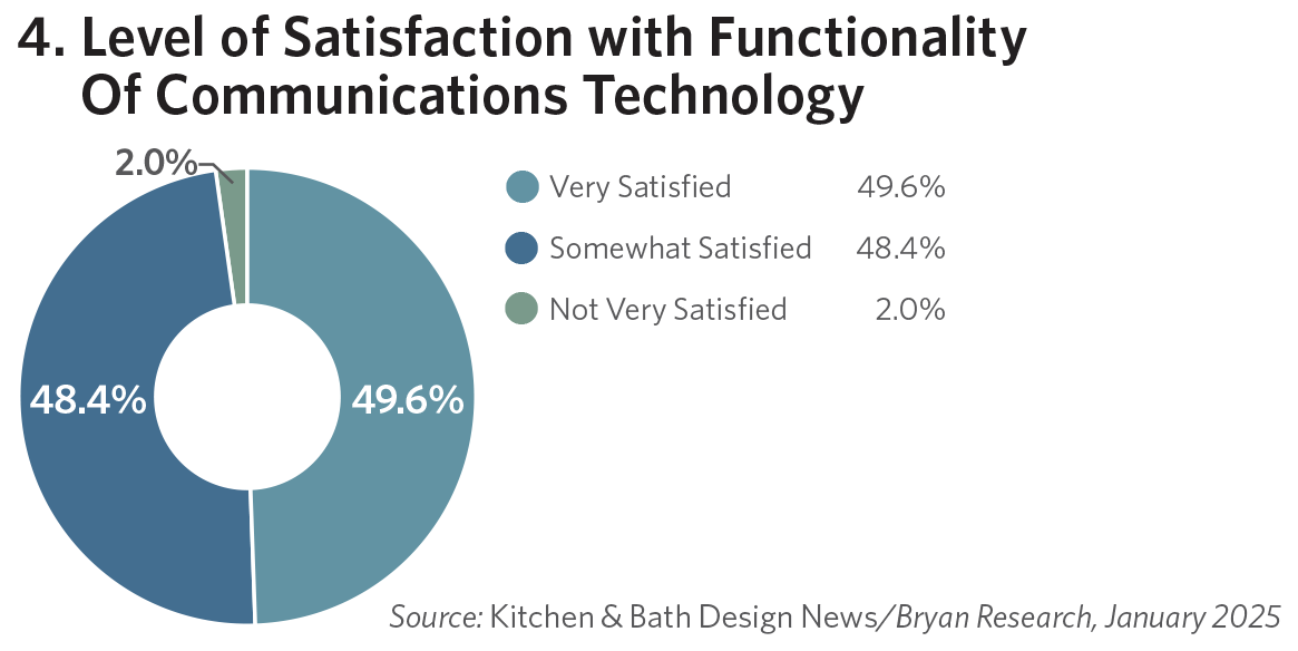 Most of those surveyed (98%) say they are either “very” or “somewhat” satisfied with the functionality of the communications technology they are currently using (see Figure 4). A similar percentage reports that they’re satisfied with the ease of use of that technology.