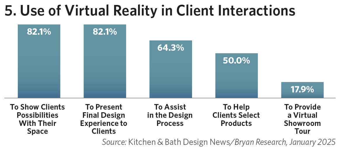In additional survey findings, nearly 80% of those polled report that they currently utilize design software. In contrast, roughly 90% say they do not employ virtual reality to assist in their interactions with clients. Of those who utilize virtual reality, it is invariably used to show clients design possibilities for their kitchen, bath, or other-room space (see Figure 5).