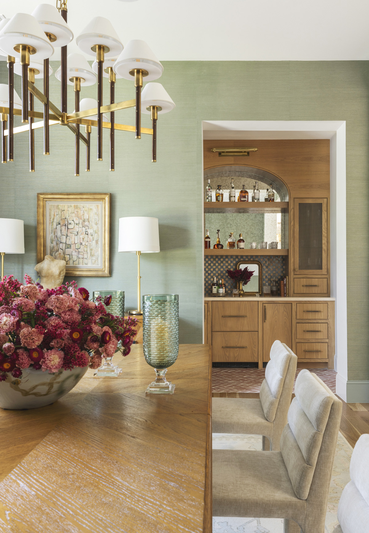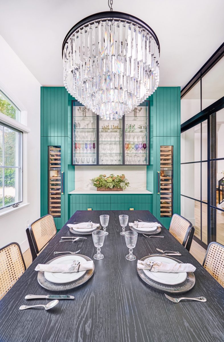 In this home, Bustamante included a beautiful feature wall with wine storage and display as part of a formal dining room. He also designed a moody bar/wine storage cabinet in the homeowners’ great room.