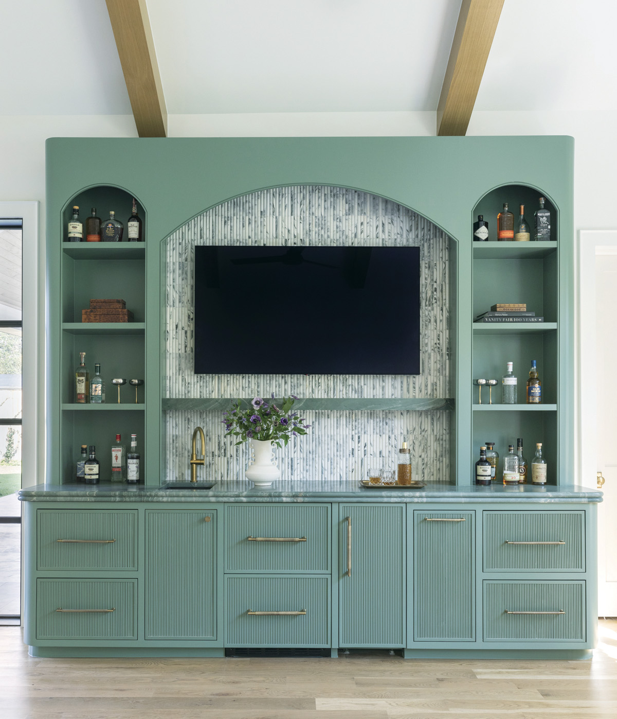 “We really wanted to include some architectural features, which we accomplished by curving the shelves,” she indicates. “The curves also play off of the straight lines of the brick.”