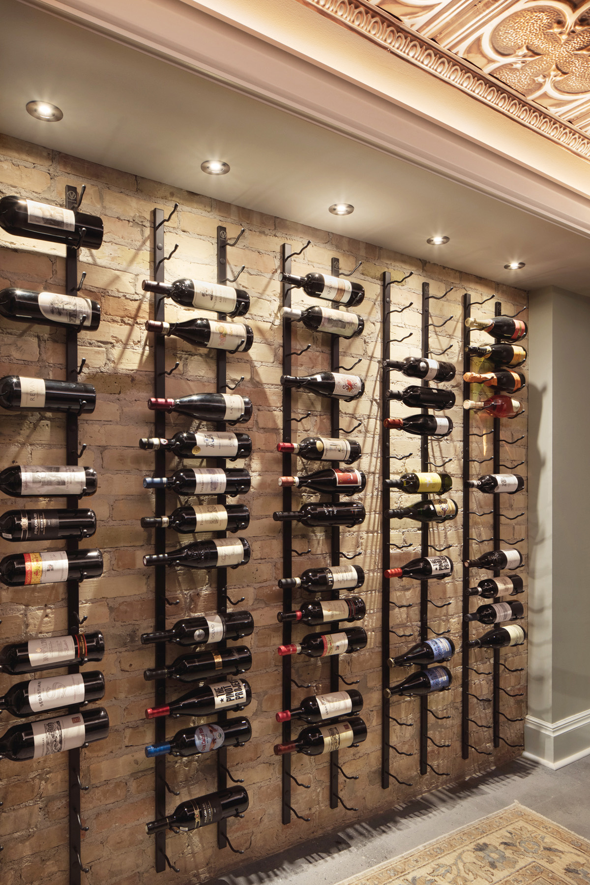“It still showcases and displays wine bottles artfully where the metal wine racking system allows the bottles to ‘float’ and be set off from the brick behind them,” he explains, adding that the Cream City brick is original to the home’s foundation. “But the display doesn’t necessarily take over the room.