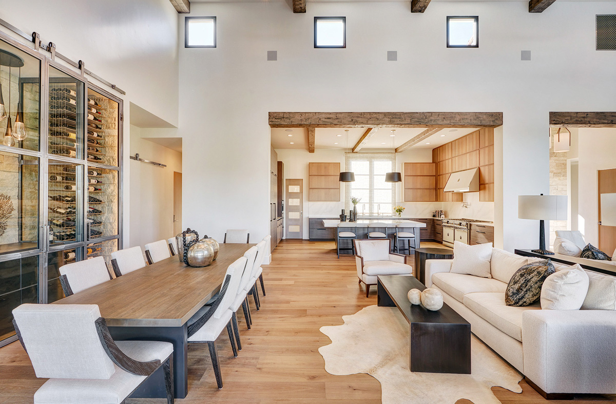Nar Bustamante created this shallow wine room as a backdrop to the dining room table, where it is visible to guests and serves as a conversation starter. Custom metal and glass barn doors slide open to reveal the homeowners’ collection. The room also includes a table for showcasing art or displaying wines that the host will serve during an event.