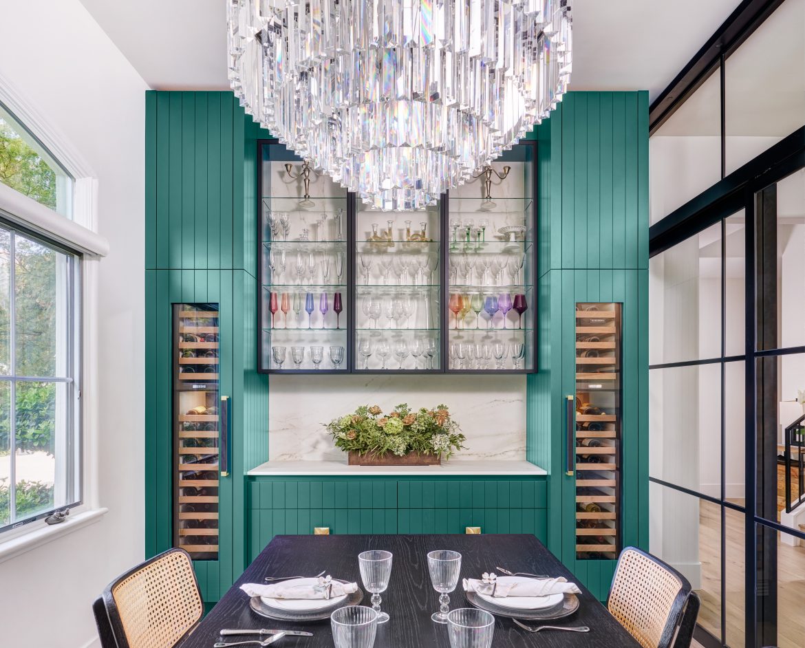 Lynn Holender often incorporates bars and wine rooms near where people entertain. In this home, the wine room is located next to the wet bar, which is accessible and visible from the dining room.