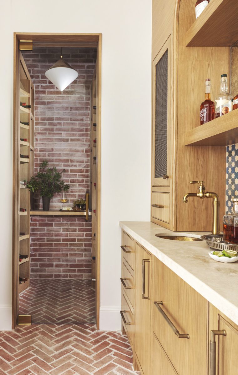 One focal-point feature of the wine room includes brick, which is set in a traditional pattern on the wall and in a contrasting herringbone pattern on the floor for added interest. White oak shelves provide enough storage for more than 200 bottles of wine, as well as accessories such as wine glasses. Holender gave the shelves a slight concave curve to ‘soften’ the visual and give a touch more room for her client to maneuver when she is working within the space.