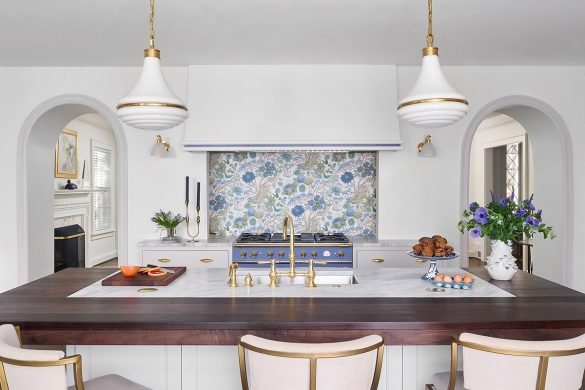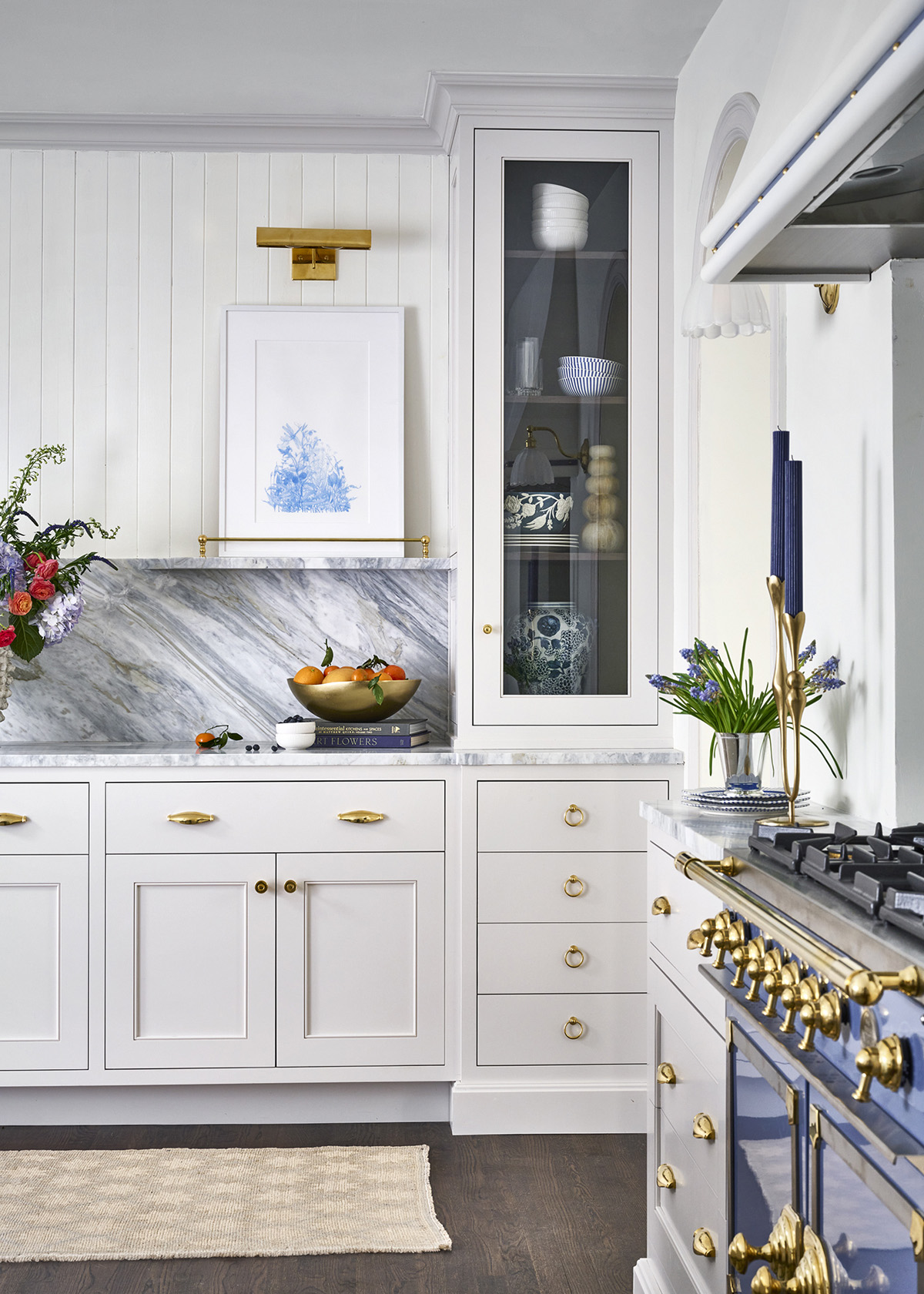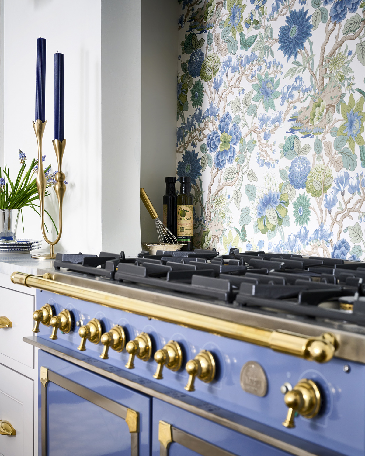 The stone’s cool tones and its blue and gray veining inspired the selection of several other finishes used throughout the space, including the GP & J Baker Little Magnolia wallpaper tucked safely behind a piece of glass and showcased to create a focal-point moment with the La Cornue range and custom ventilation hood.