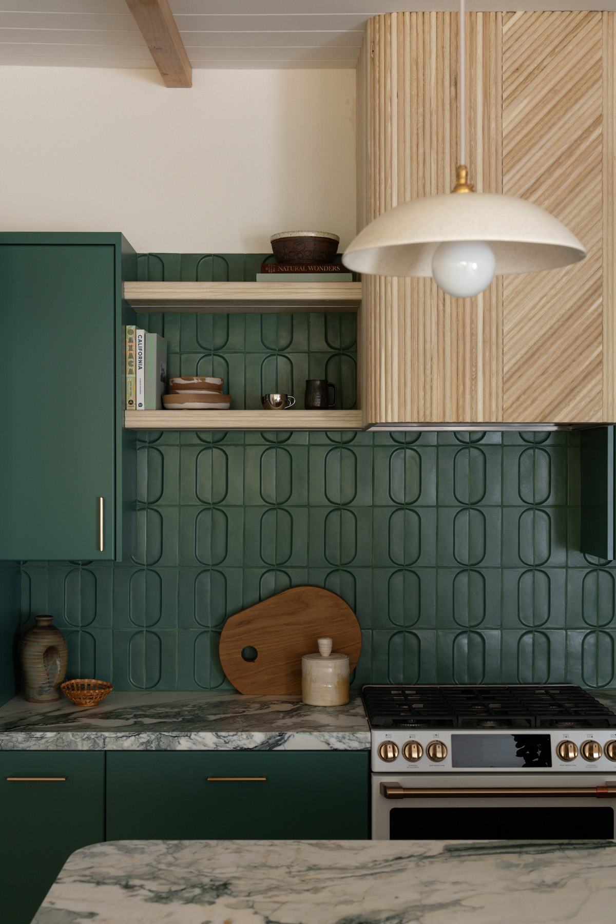To accommodate, she used Clay Imports’ 4″x8″ Oval in Cilantro. Each rectangular handmade clay tile features a partial oval imprint that, when grouped together in pairs, creates a complete oval indentation within a raised background. That dimensional design adds texture and interest to the wall behind the range.