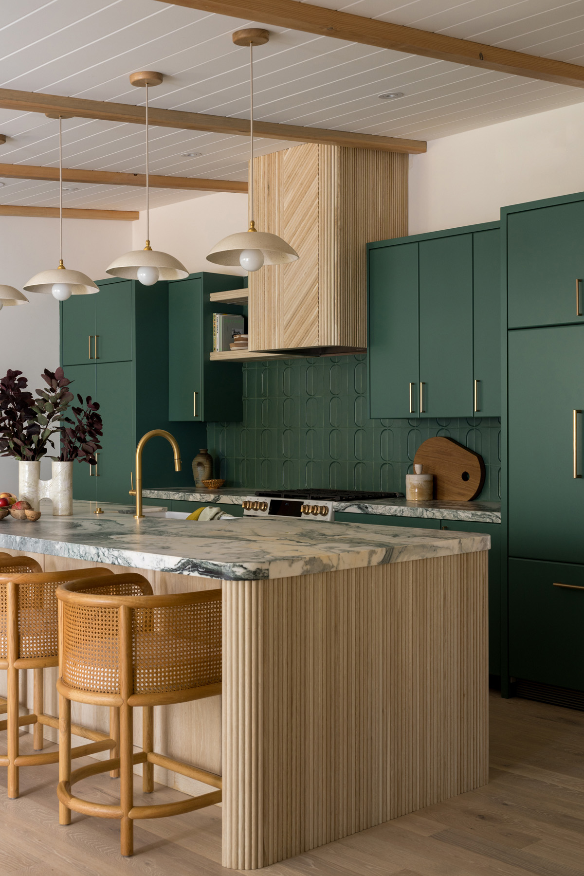 To prevent a single color from overwhelming the space, Green contrasted the dark hue with light white oak. Showcased in multiple places, it notably stands out as fluting on the island and ventilation hood surround, the latter of which is designed with grooves that run in multiple directions.