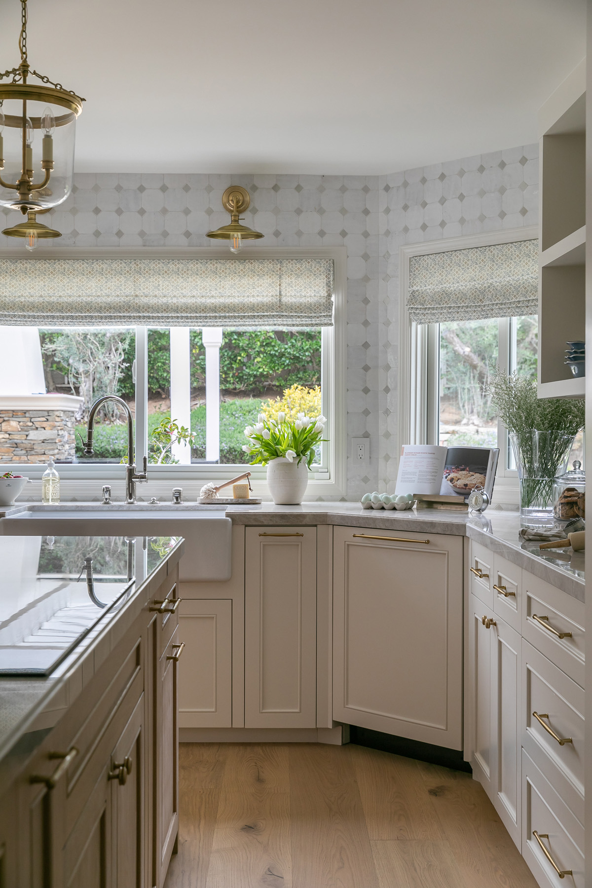 For these clients, traditional design was the right direction to serve as a backdrop for their abundant heirlooms. As part of that, the designer, who worked in collaboration with Cornerstone Construction, included elements like beadboard; warm white flat panel cabinetry; mixed-metal hardware including Polished Nickel and Satin Brass; a furniture-style island, and zellige tile from clé. The neutral-toned Zio & Sons 4″ Sea Salt octagon and 1″ Weathered White bouchon tiles combine to give the traditional tile an updated look with ‘clipped’ corners and ‘dot’ centers.