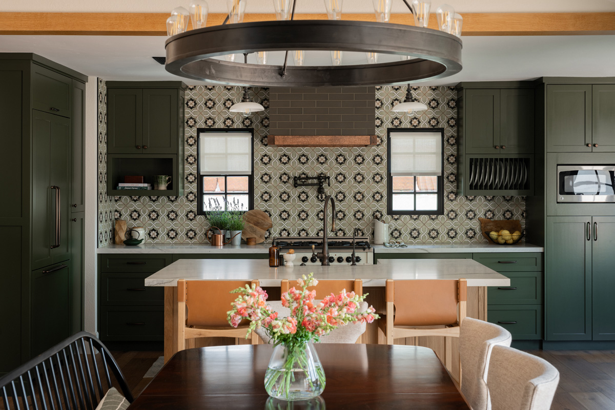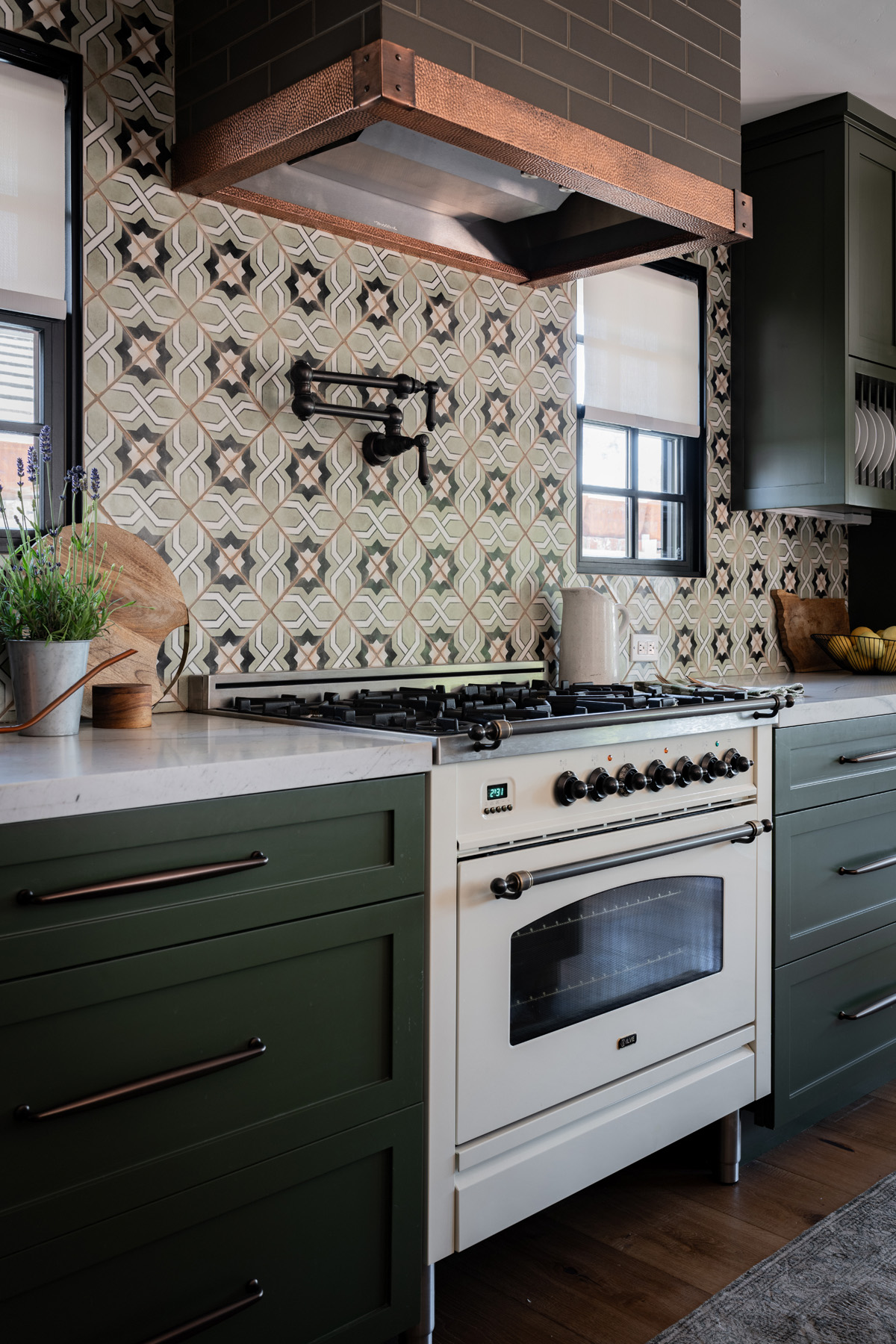 That’s where the focal-point Bedrosian’s Casablanca 5″x5″ ceramic tile comes in. Its Torres colorway acts as a complement to the cabinetry painted in Benjamin Moore’s Windsor Green, which won out over a dozen or more other olive-toned variations.