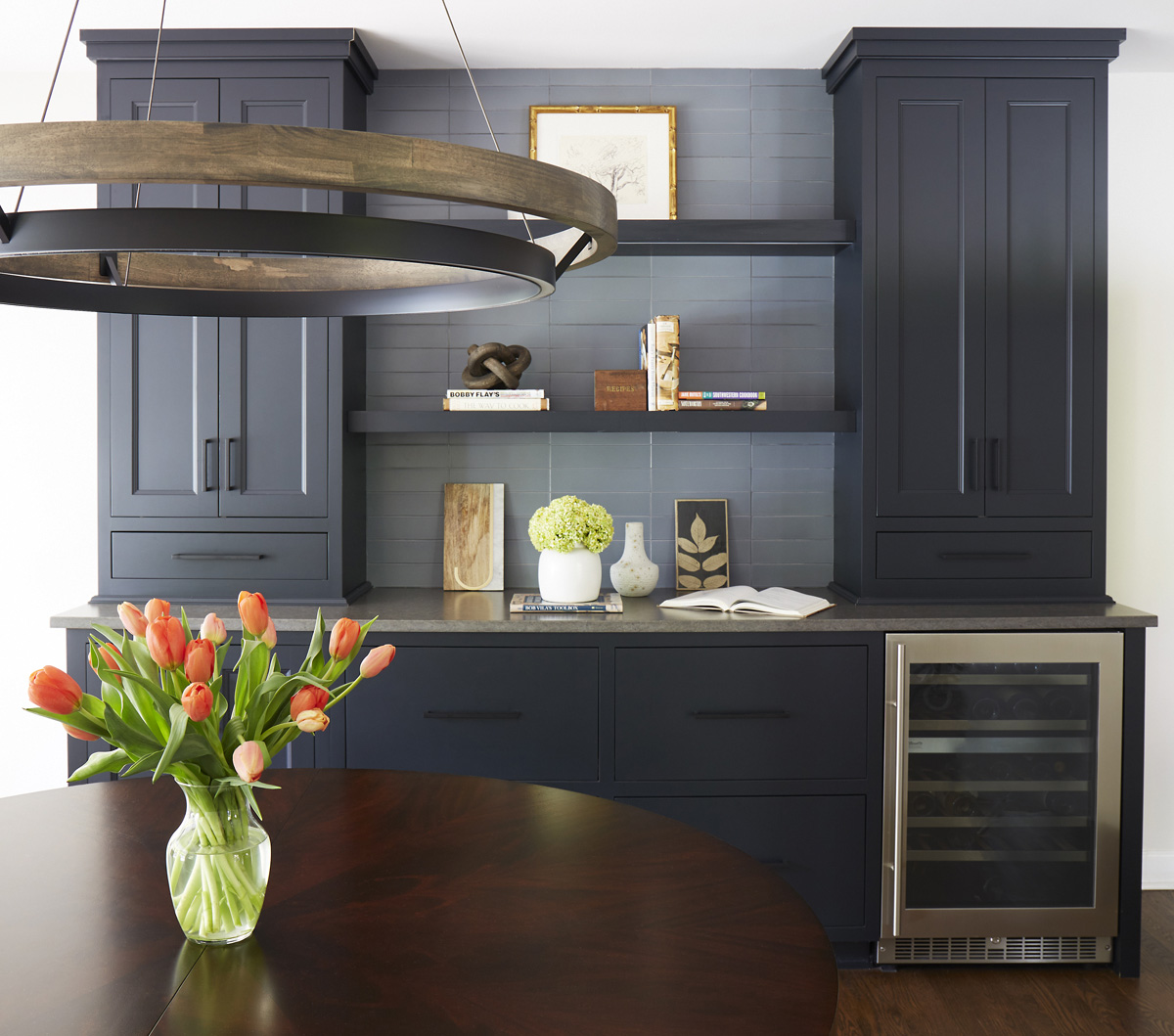 “I like to use Savoy because it’s a great price point, and it has quite a few styles and colors that make it easy to work with,” she says, adding that she repeated the Savoy Lantern tile as an accent in an adjacent custom buffet but mixed it up by selecting a flat tile and stacking it horizontally. “I also love the deep, dark blue color. It brings color into the space and it works nicely with the white oak cabinetry. There is a lot of wood in this kitchen, so the blue tiles help to visually soften the space and keep it from being too masculine.”