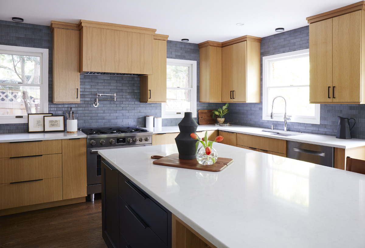 The Mont Blanc quartzite countertops, which feature a leathered finish that matches the matte finish of the backsplash tile, are also integral to the design. The natural stone sits atop the perimeter cabinets where its light, neutral colorway coordinates with the range. On the island, which is a light oak that brightens the space, the quartzite serves as a durable work surface.