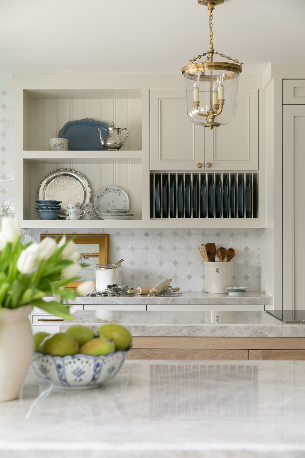 “She loves to talk to her family while she is cooking, so having the cooktop in the island functions better for her household,” she explains. “Without the hood, I wanted to make sure their kitchen still had a focal point. I was super intentional with the cabinetry layout, including space details like the plate rack on the back wall, wine fridge, open shelving and that beautiful backsplash. All of these things, including carrying the zellige tile up and around the windows, really created a beautiful moment.”