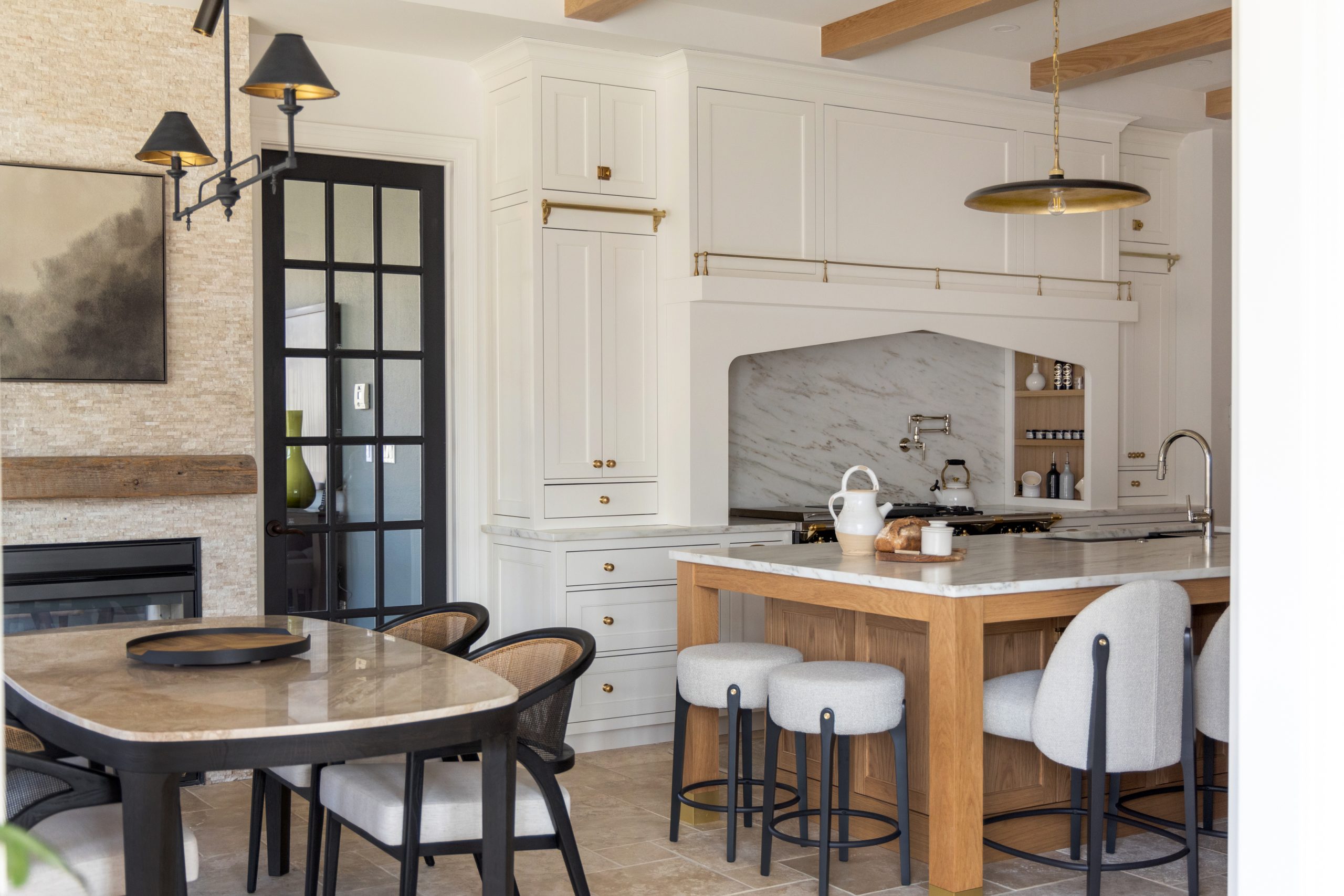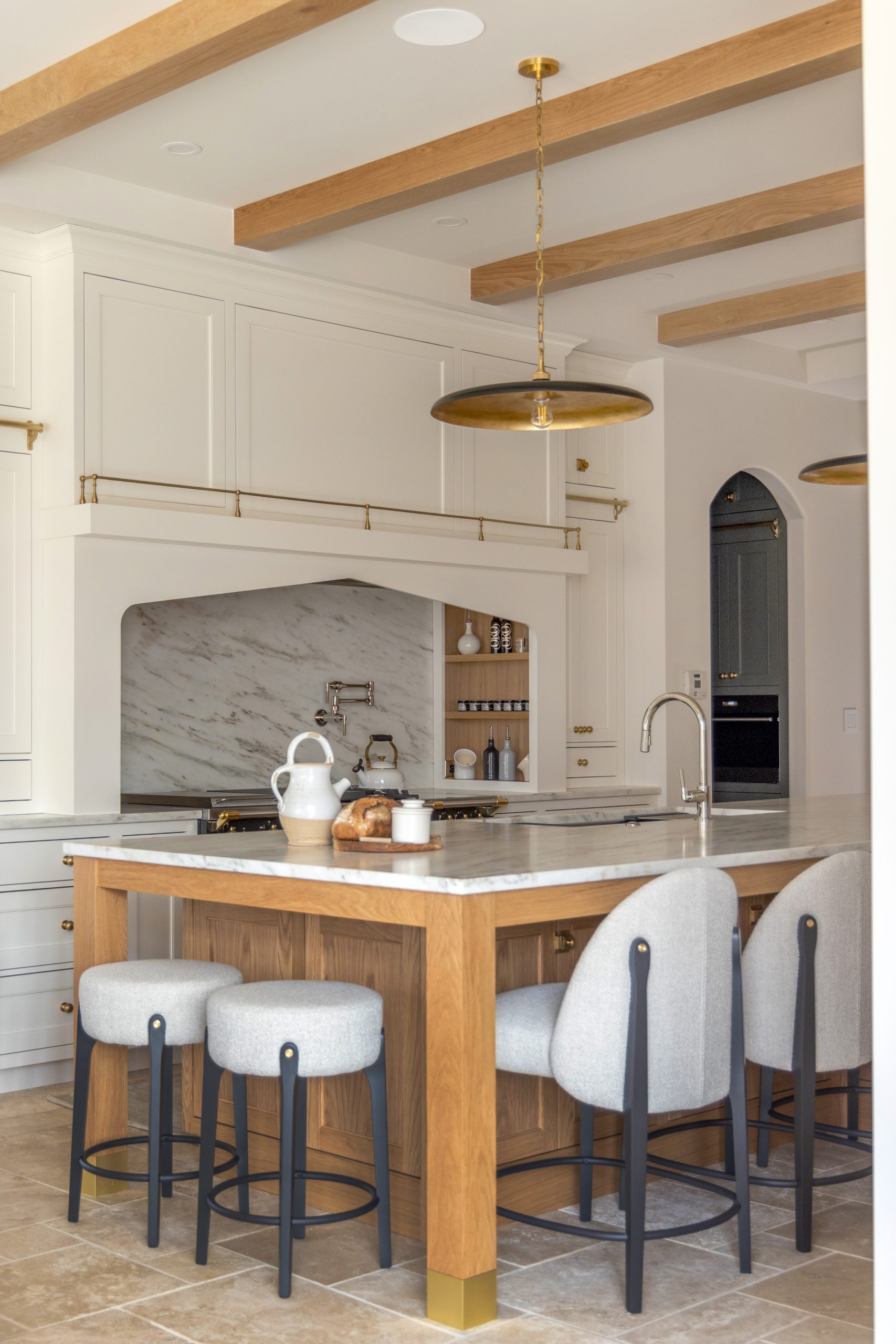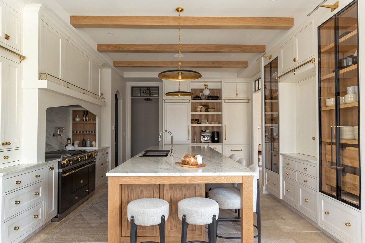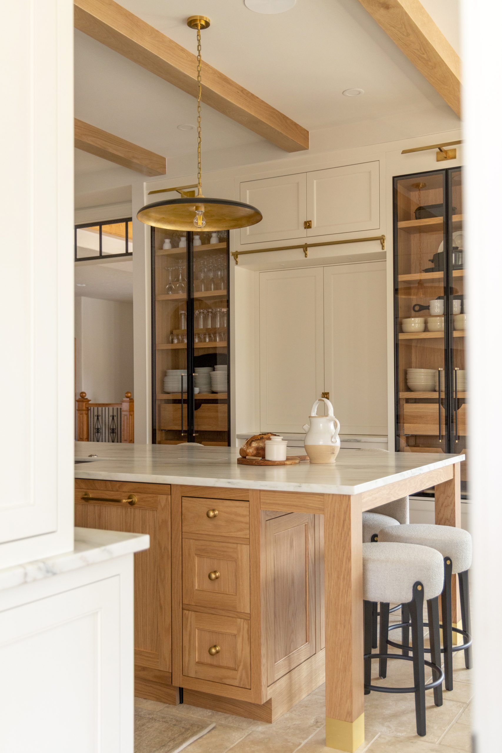 With these parameters in place, the couple opted for a mix of painted and stained cabinetry from Neumann Custom Woodworking where the perimeter is a warm Stoneware color and the island, interior cabinetry accents and ceiling beams are natural white oak.
