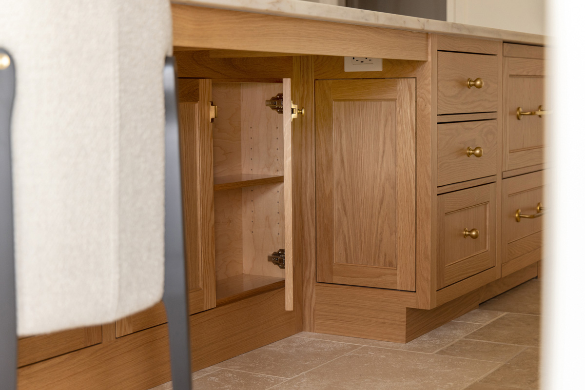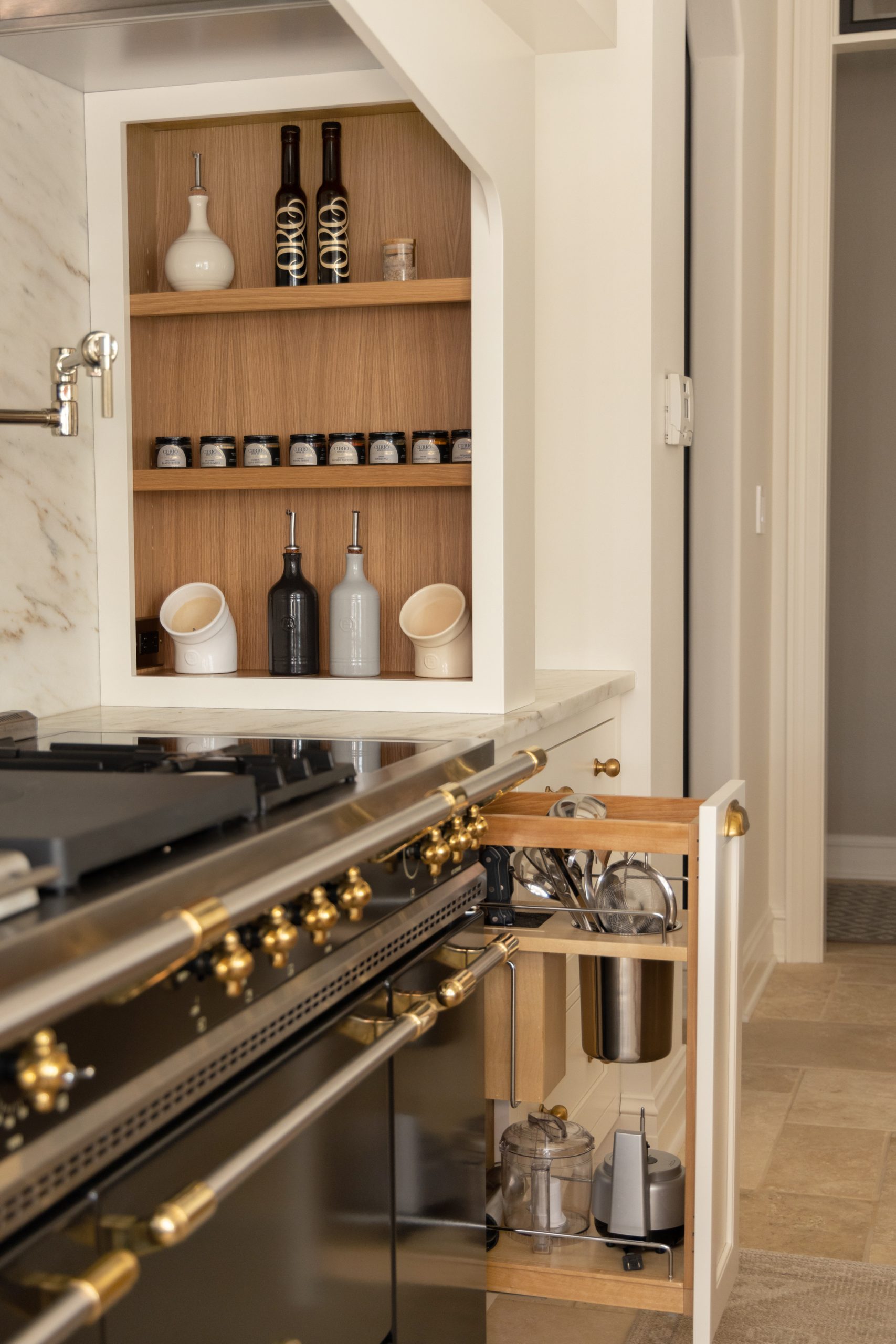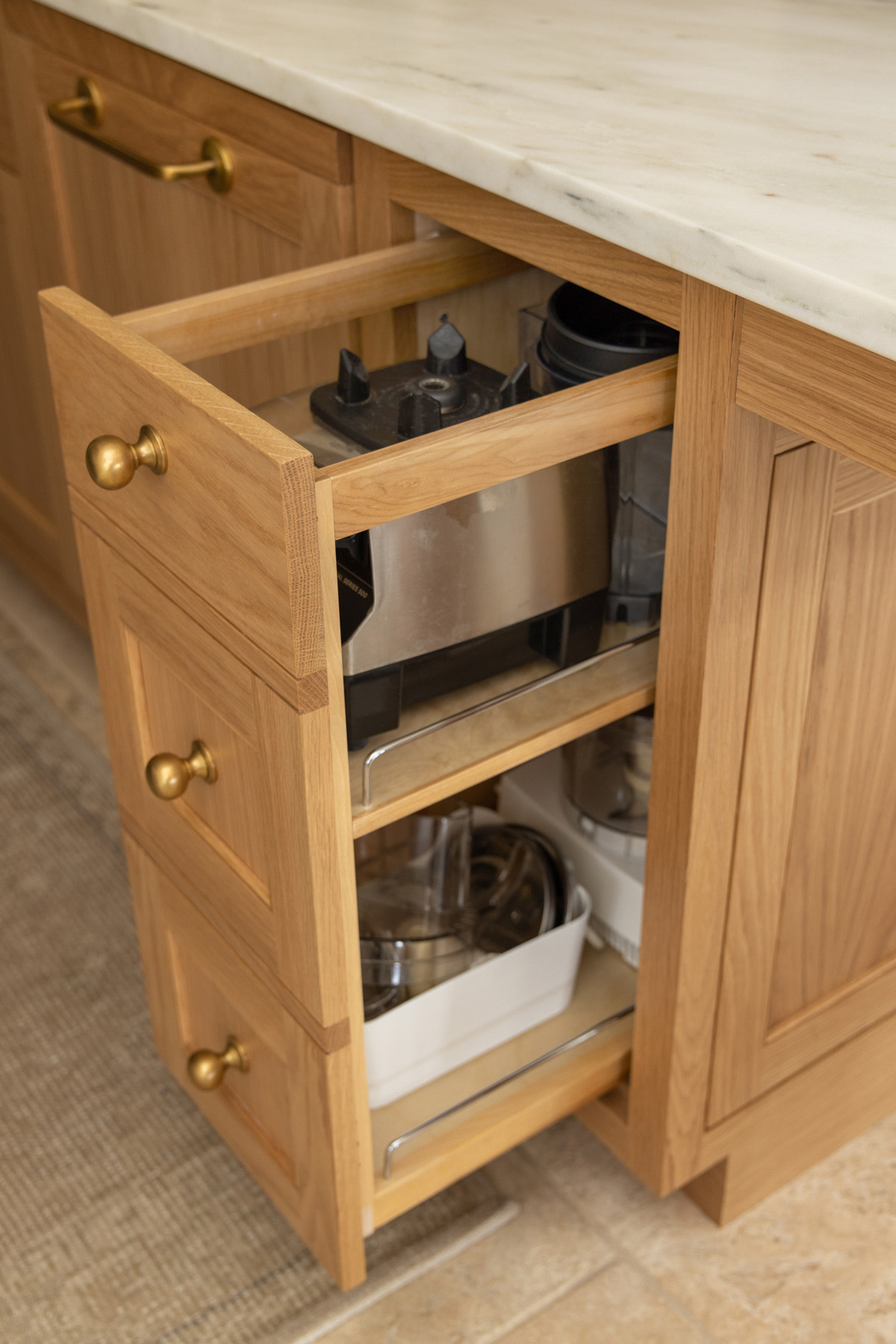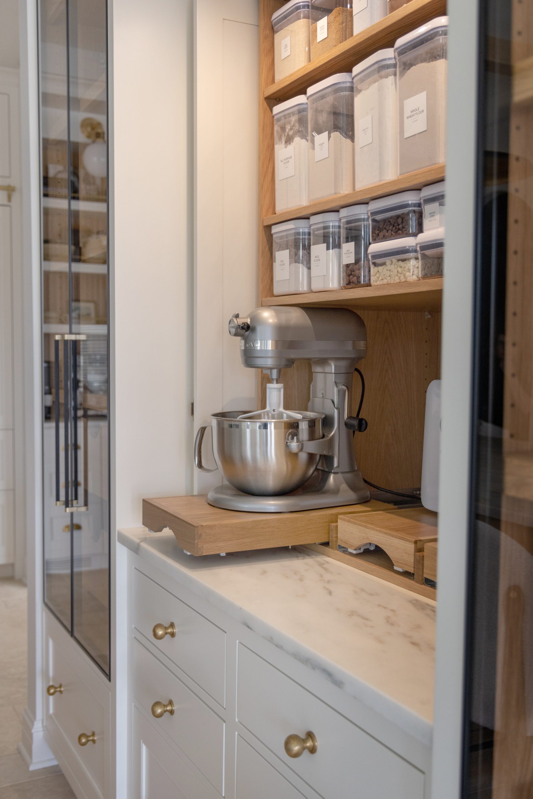 A pair of pocket doors retract into the cabinetry, revealing multiple shelves and countertop-level rollouts that allow her to keep her baking appliances plugged in and ready at a moment’s notice. The cabinet’s relatively shallow depth provides efficient storage while also leaving some countertop work space. Base cabinetry drawers keep additional supplies and ingredients handy.