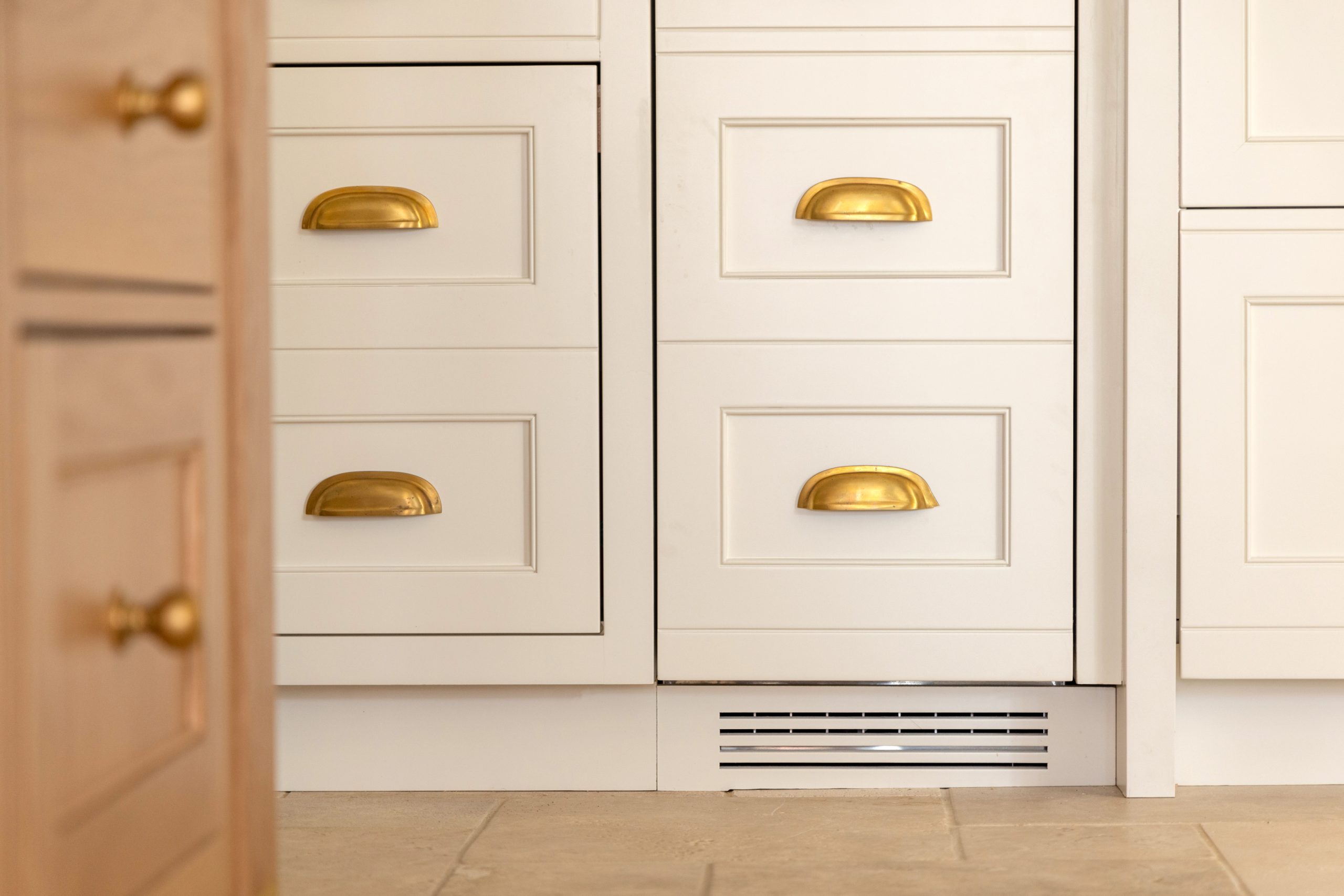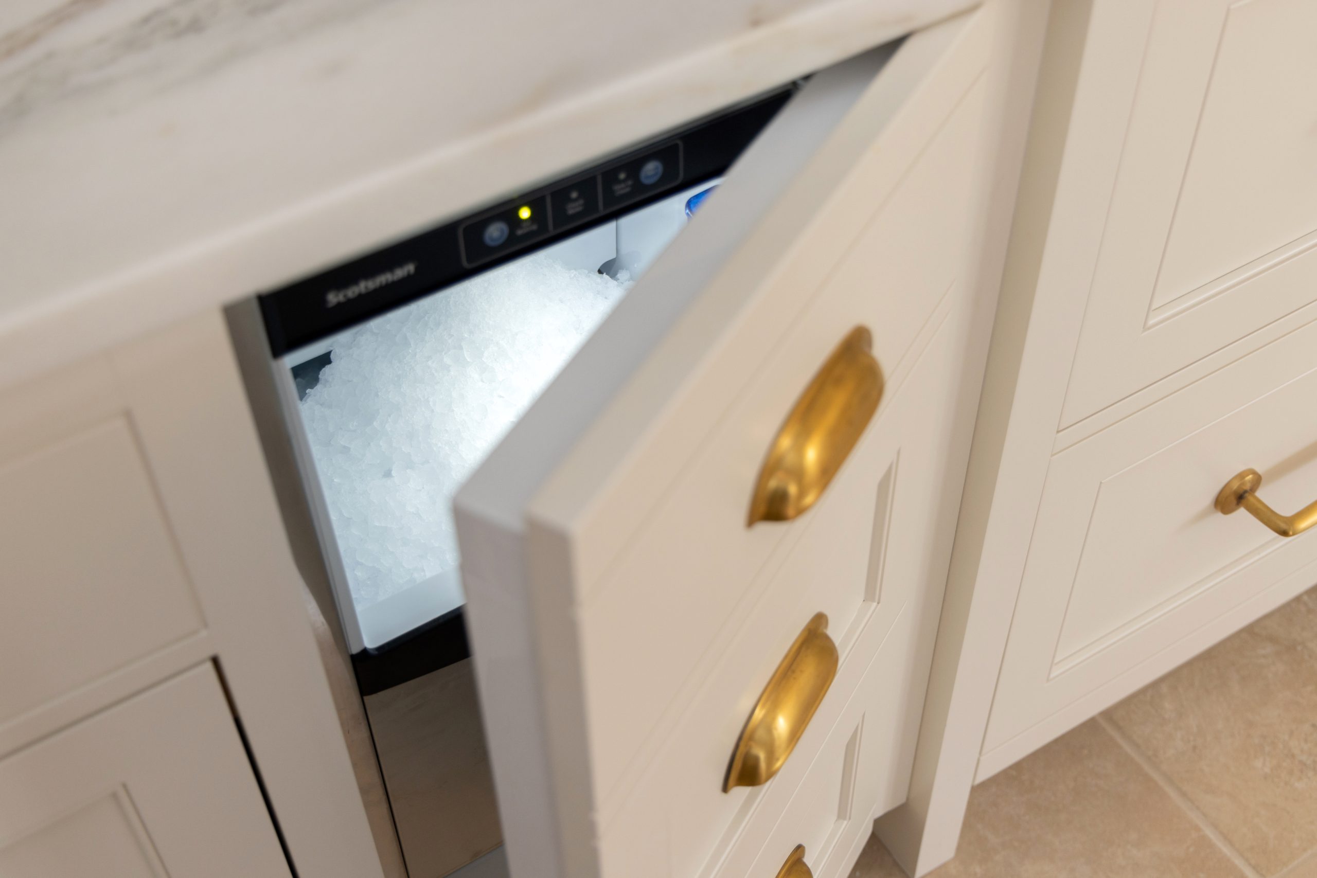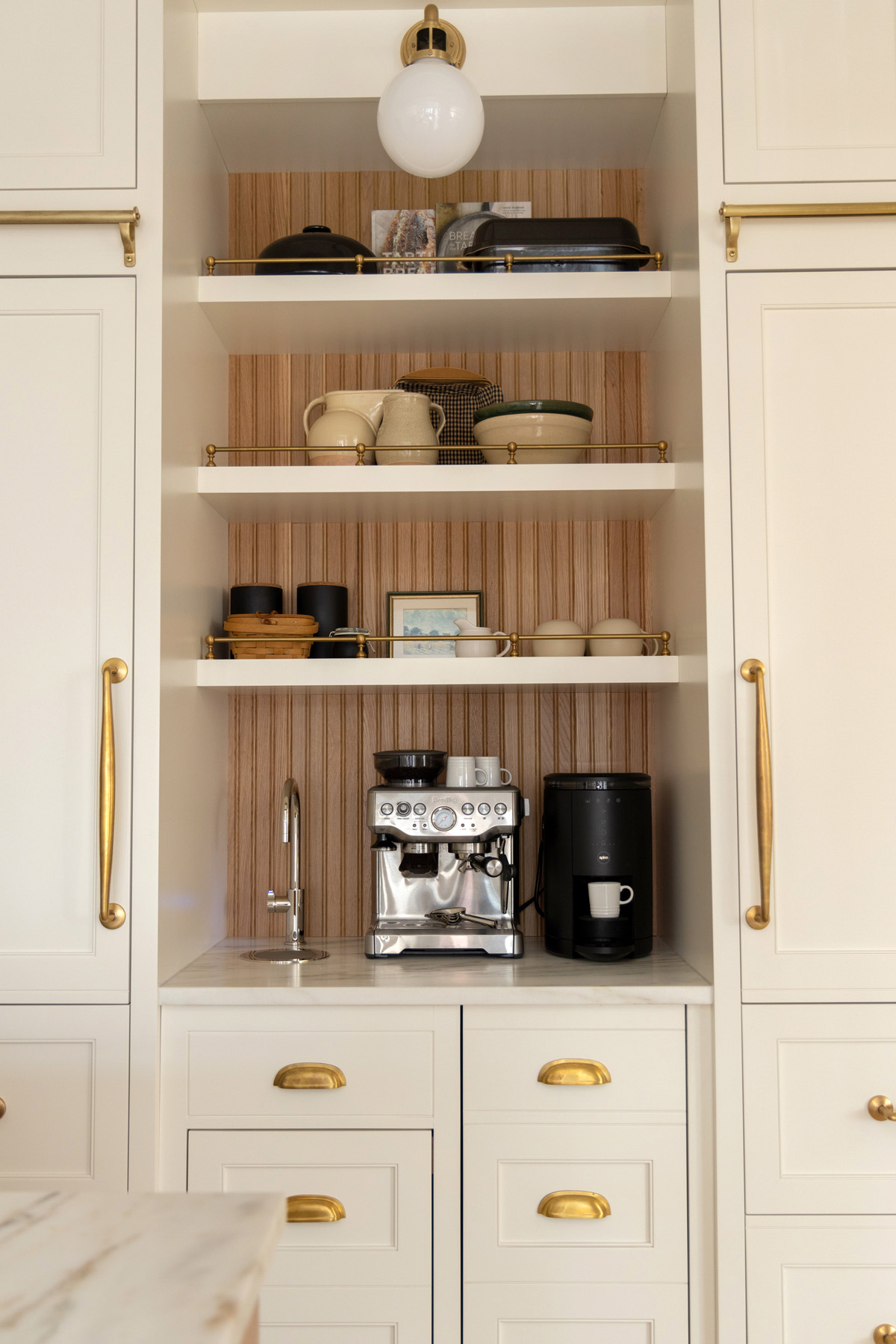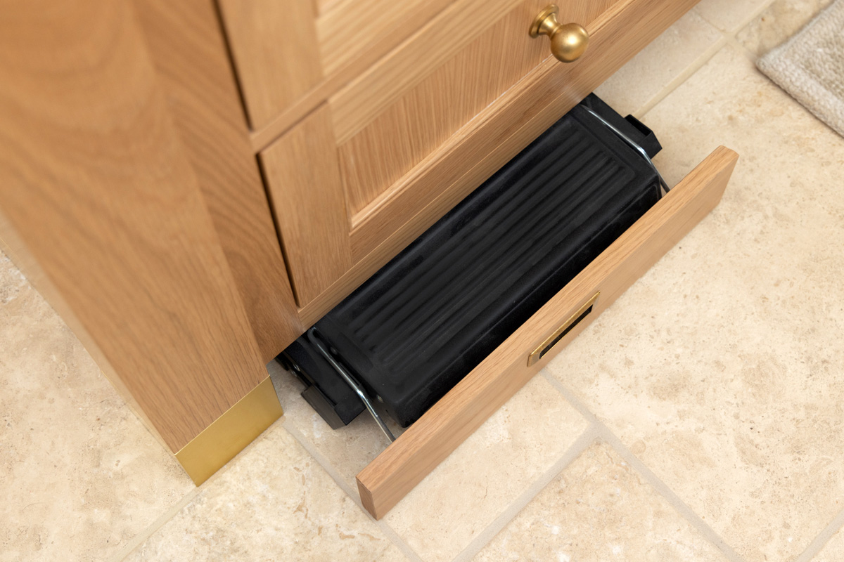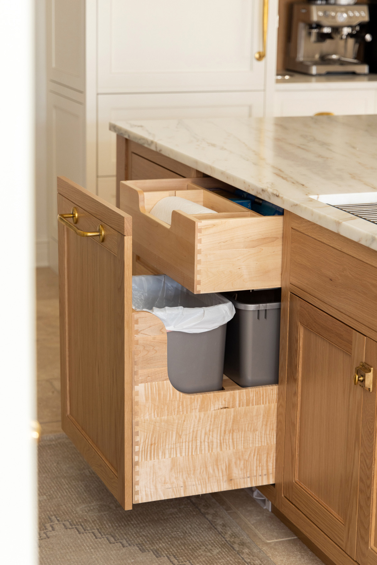 A pair of pocket doors retract into the cabinetry, revealing multiple shelves and countertop-level rollouts that allow her to keep her baking appliances plugged in and ready at a moment’s notice. The cabinet’s relatively shallow depth provides efficient storage while also leaving some countertop work space. Base cabinetry drawers keep additional supplies and ingredients handy.