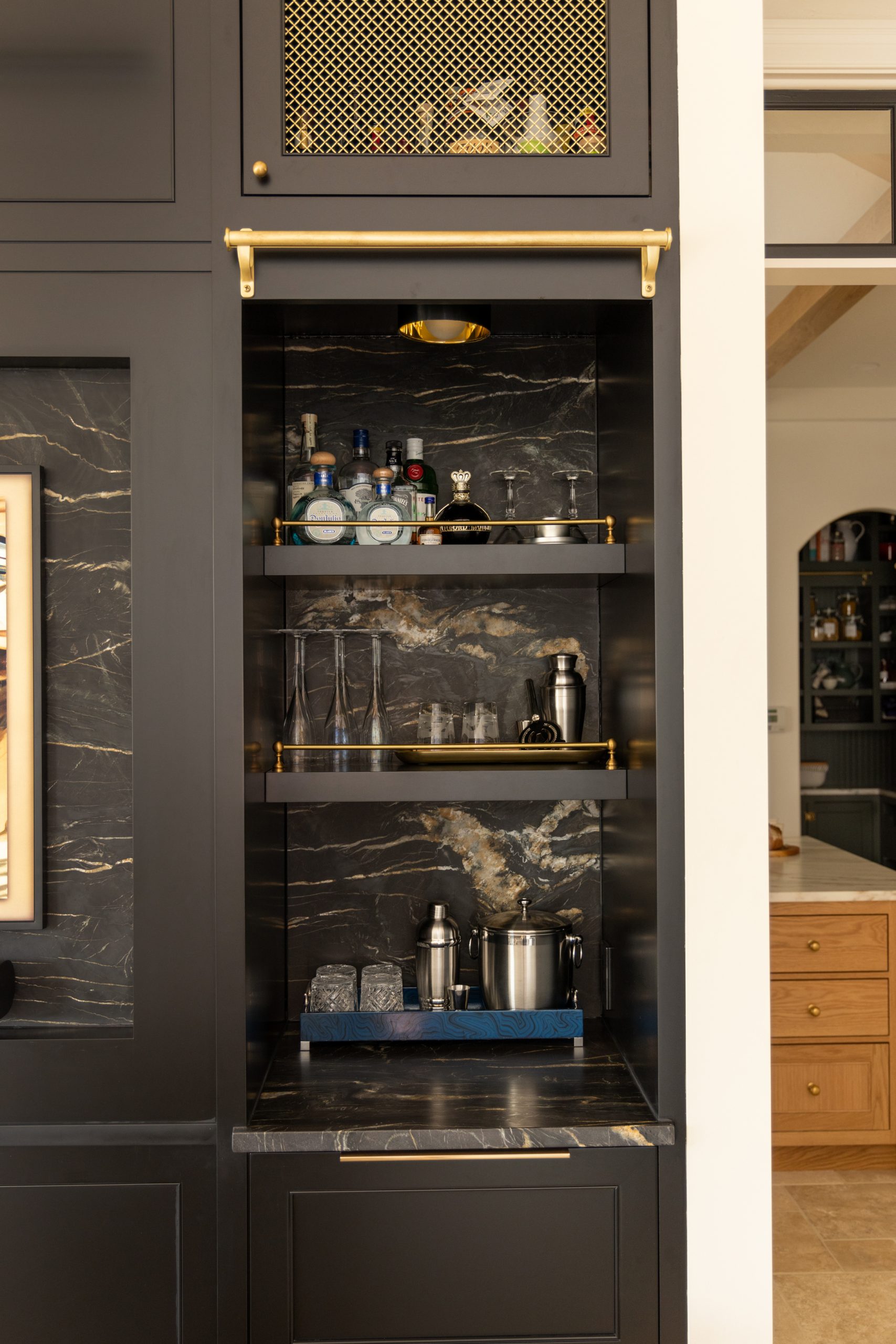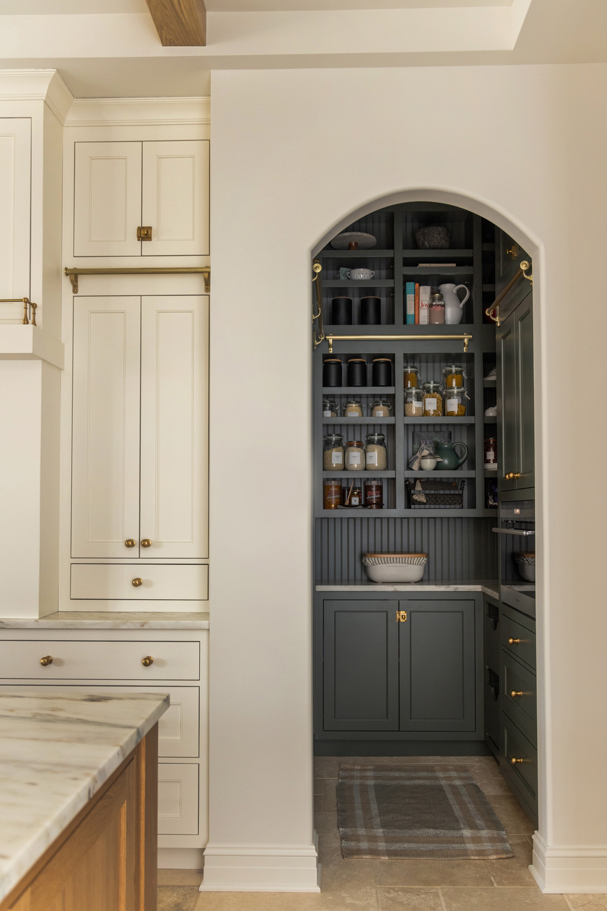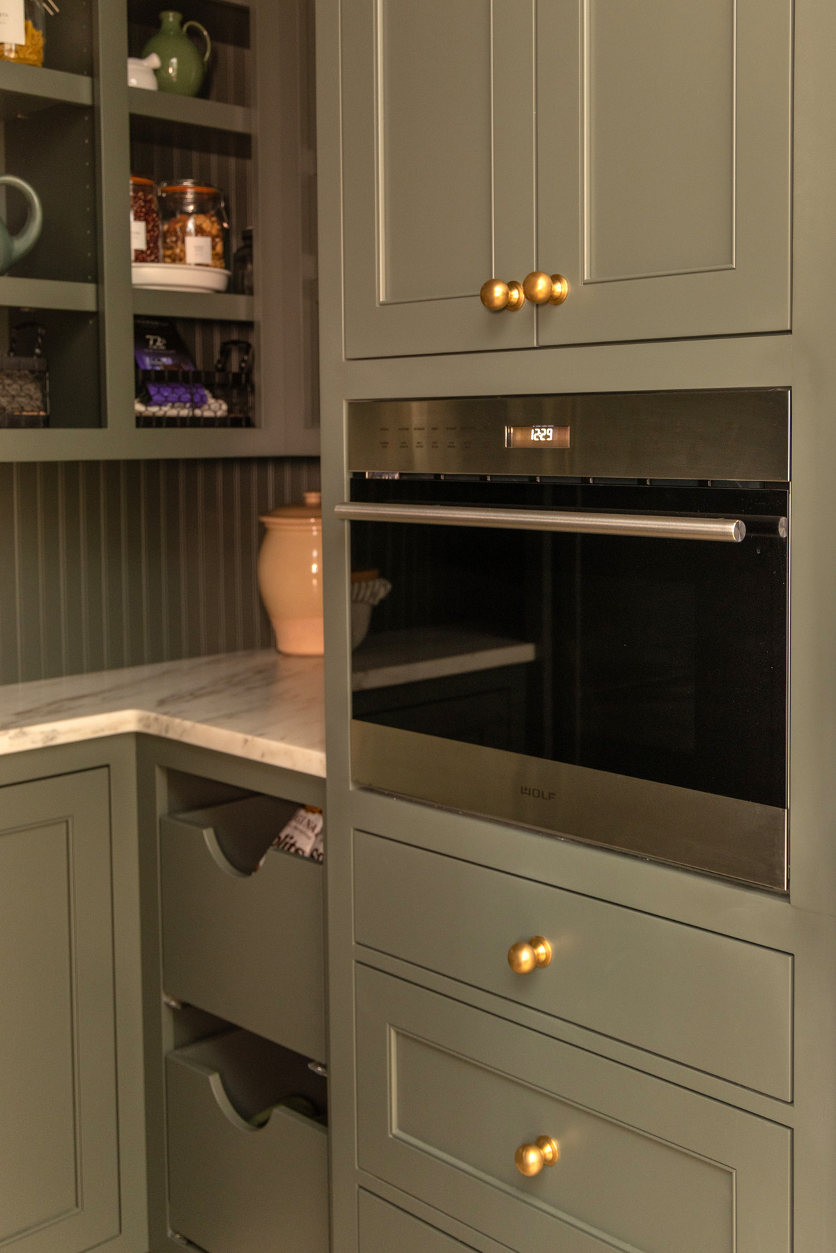As part of the renovation, Krista Benton also redesigned the butler’s pantry and increased its footprint by grabbing a few feet of closet space from an adjacent bedroom. Though small, the room packs a punch with its Sherwin-Williams Pewter Green cabinetry and honed Imperial Danby marble countertop that matches the kitchen.