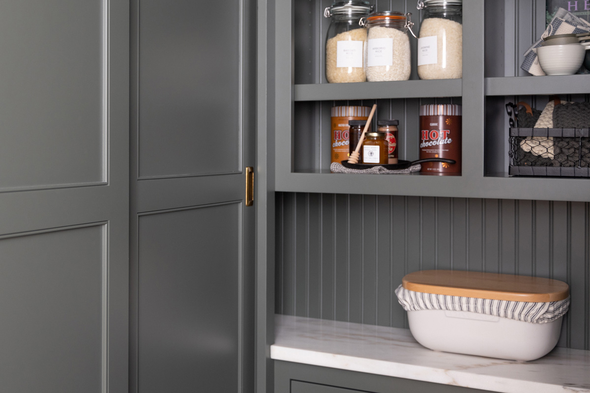 “The wall color is the same color as my client’s media room,” she indicates. “She loves it and thought it would be a fun pop of color for this cute, tucked-away pantry.”