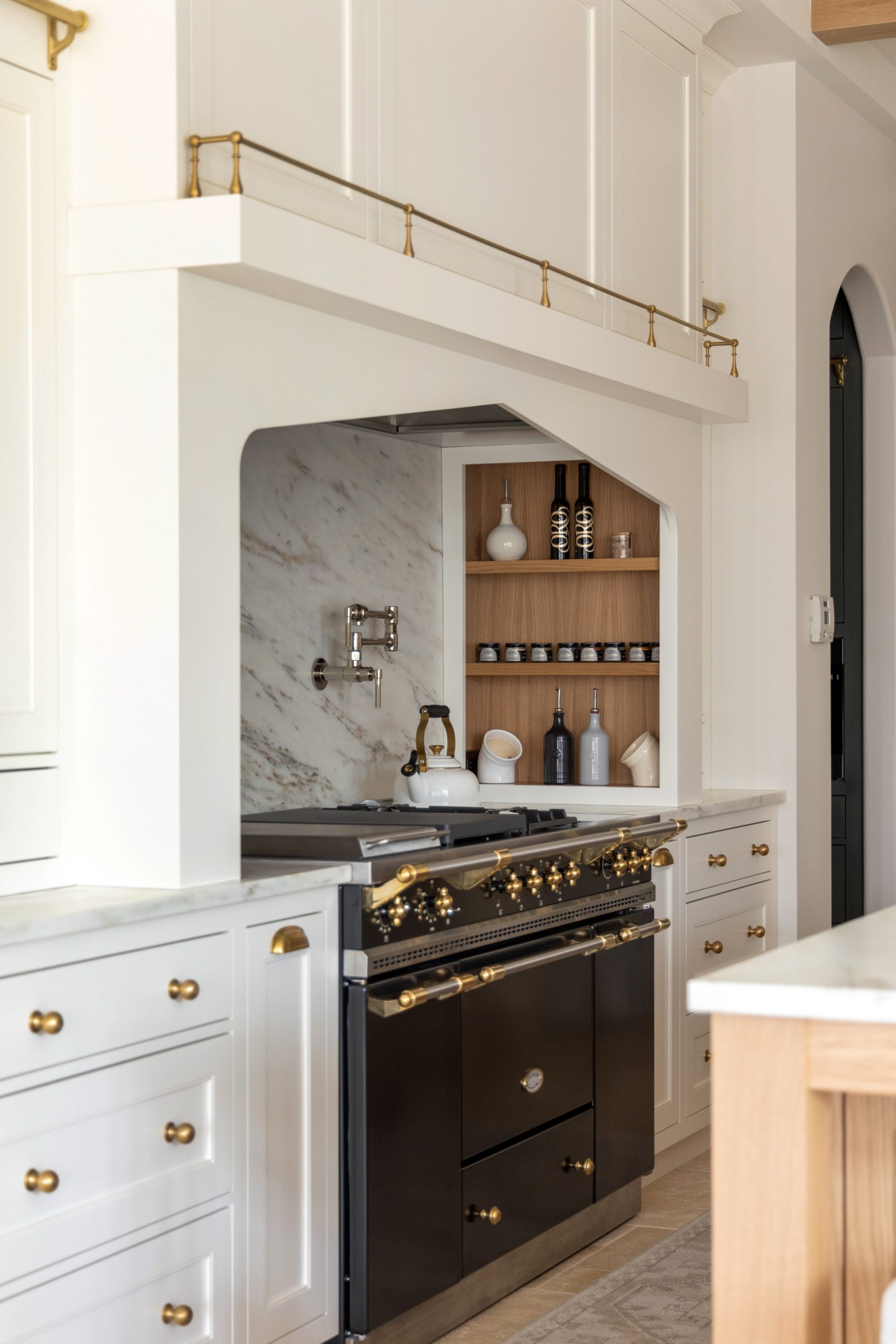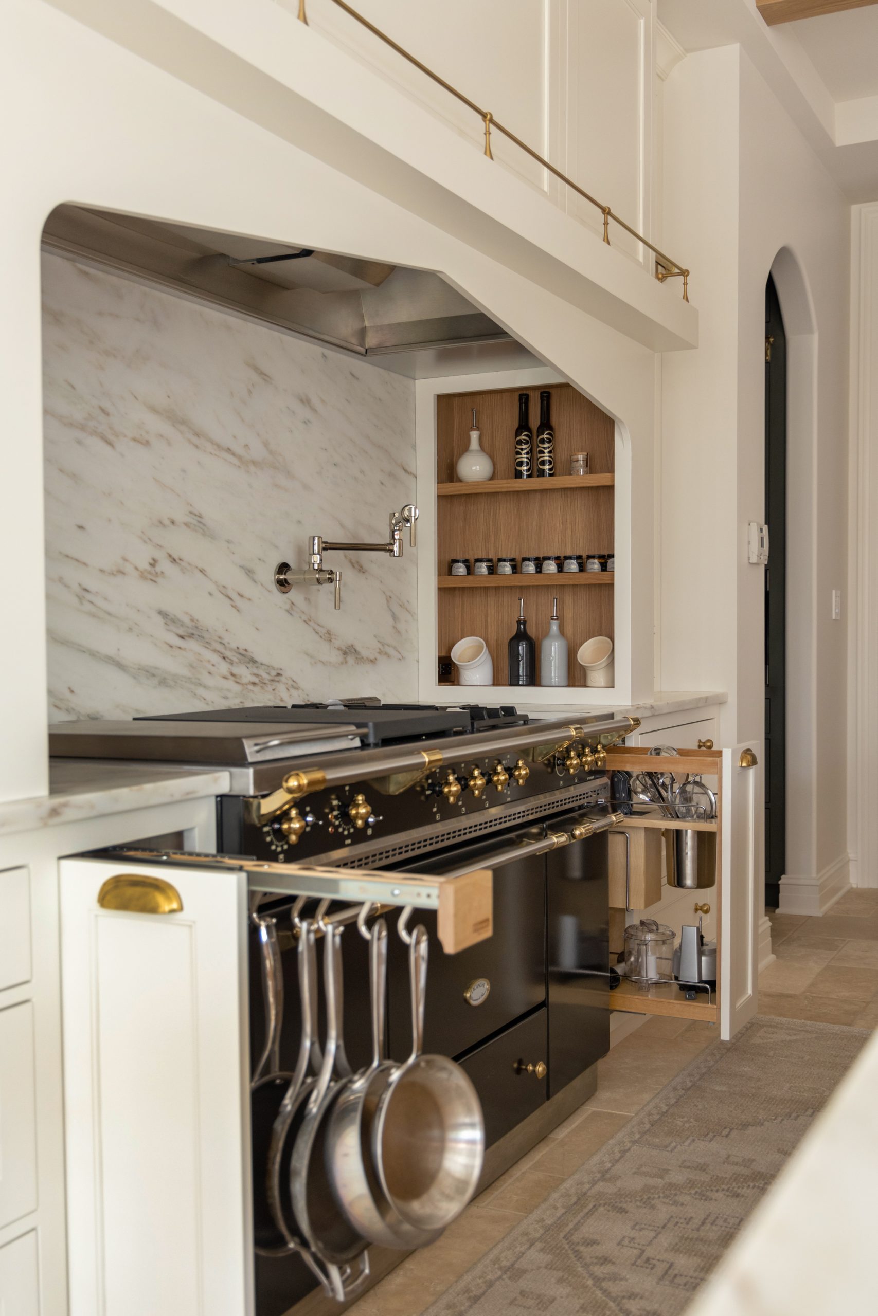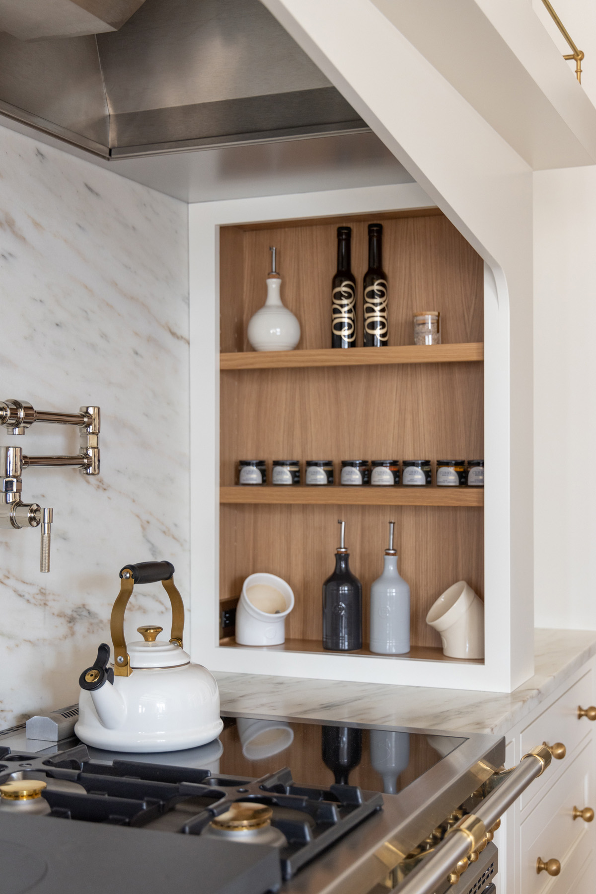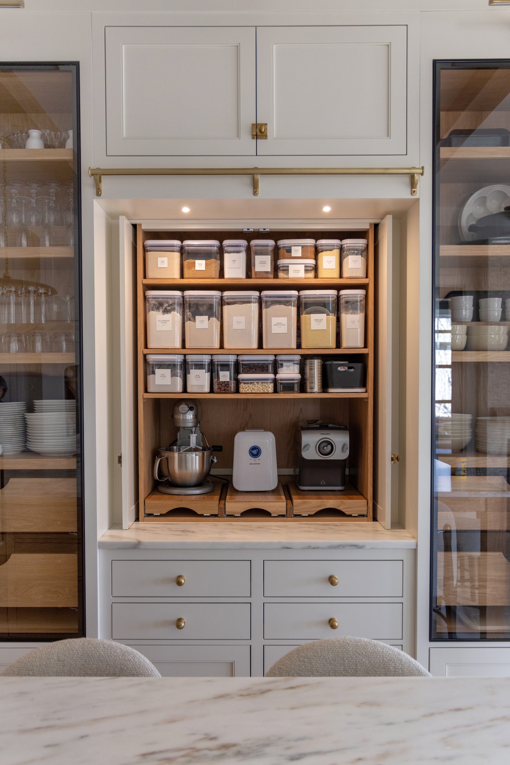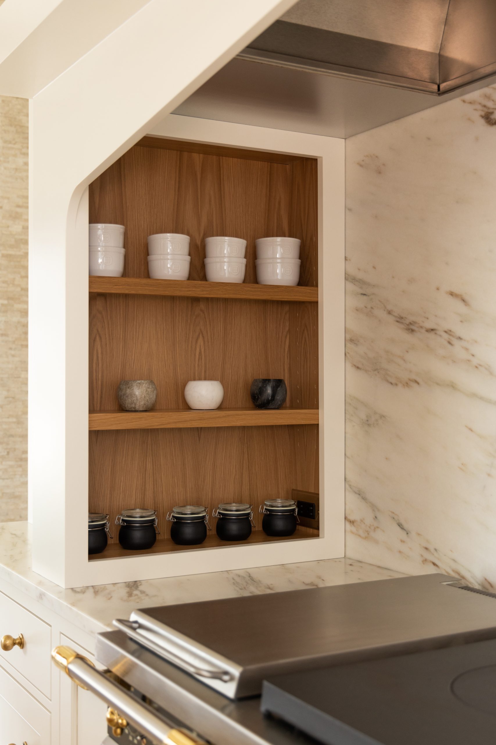 Full-depth cabinetry on one side accommodates a Wolf speed oven with storage above and below. Shortening the depth of the cabinetry on the remaining two walls gives her client enough room to open the oven and maneuver freely within the space. Shelves on the back wall display neatly organized dry goods.
