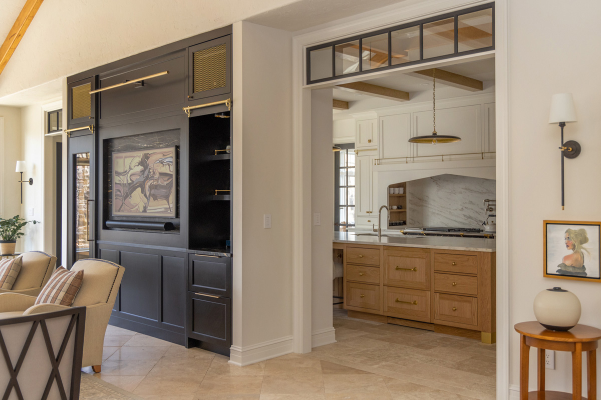 “We didn’t move or change the depth of this wall, so it was a bit of a Tetris situation where we were playing with miniscule increments of inches,” she says. “For each side of the wall we had competing depth requirements with a lot of things fighting for the same space. It ultimately affected everything on both sides of the wall – even the range wall, walkways and island location in the kitchen as well as how we centered everything on the great room side. We had many different renditions, but we ultimately got everything to work together.