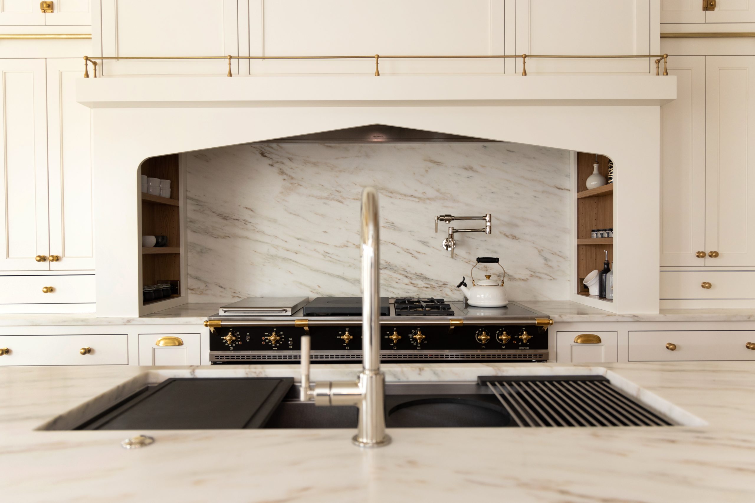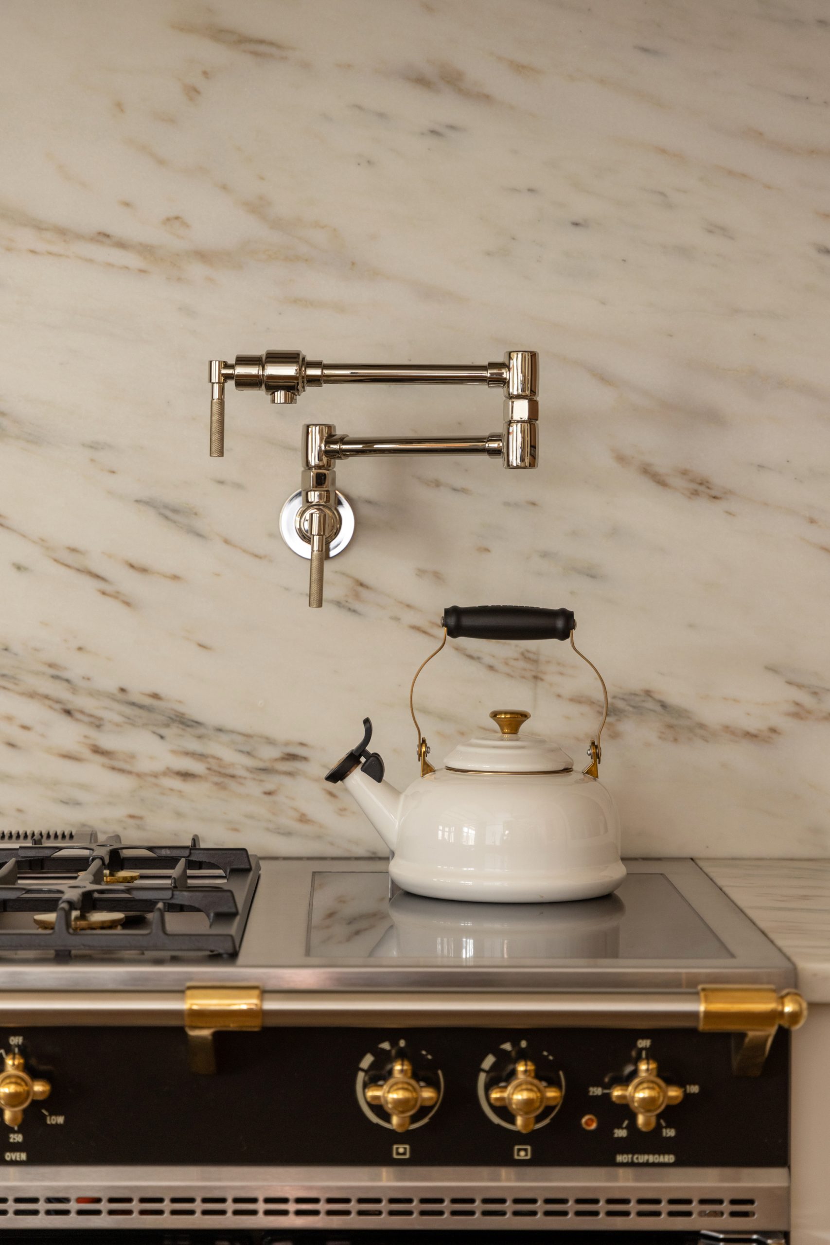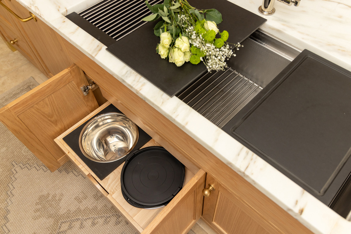 The oak island, which is topped with honed Imperial Danby marble, grounds the space and is home to a Miele dishwasher and Fisher & Paykel dishwasher drawers. It also offers abundant storage and its custom construction meant Benton could design specialized solutions such as an integrated step stool in the toe kick and a paper towel holder above the double pullout trash bins. Shallow cabinets on the seating side of the island are perfect for storing less-frequently used items, and a custom cabinet beneath the 4′ workstation sink from The Galley corrals extra sink accessories when they aren’t being used.